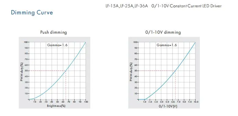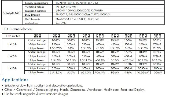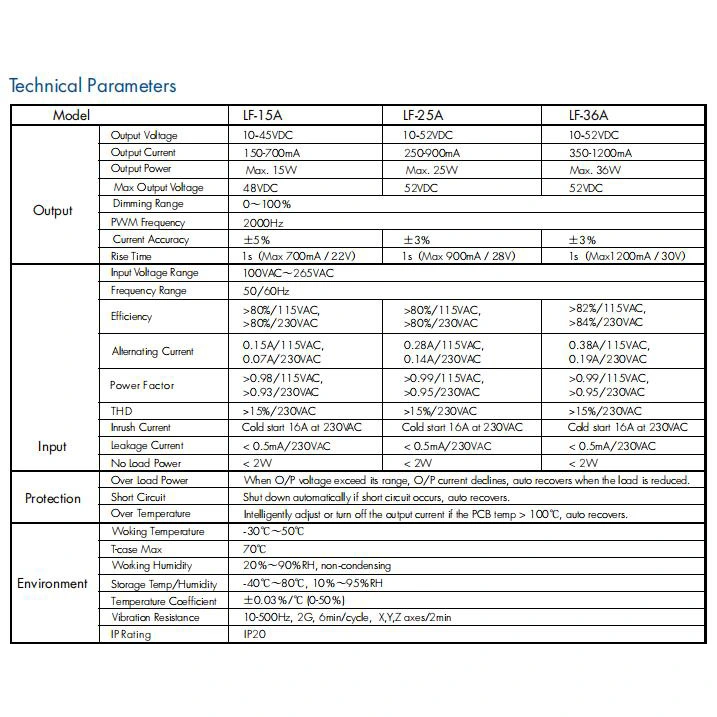 Автоматично съответствие на напрежението: Драйверът автоматично настройва изходното си напрежение, за да съответства на изискването за предно напрежение на свързания LED товар, в рамките на определения диапазон (напр. 12-24VDC, 20-40VDC).