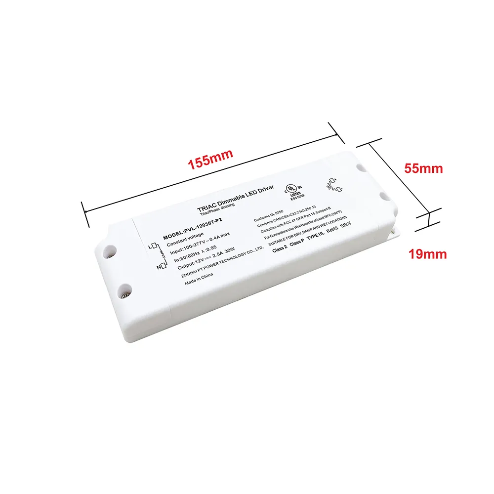 Висока ефективност и спестяване на енергия · Силна гъвкавост: Ефективността на преобразуване на енергия достига до 92% или повече, консумация на енергия в режим на готовност <0,3 W, отговаряйки на националните първокласни стандарти за енергийна ефективност; Широк диапазон на входно напрежение AC100-277V, съвместим с глобалната общинска мощност; Размерът на корпуса на LED драйвера с постоянно напрежение е 85 × 55 × 30 mm, с три метода на инсталиране, покриващи сценарии за обновяване на дома, търговски и инженерни сценарии.