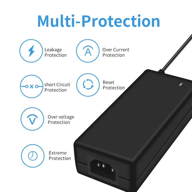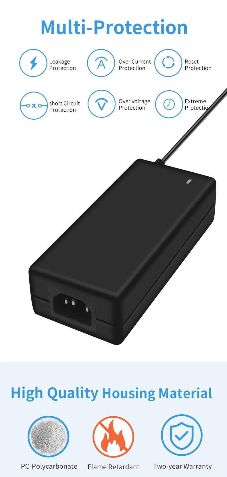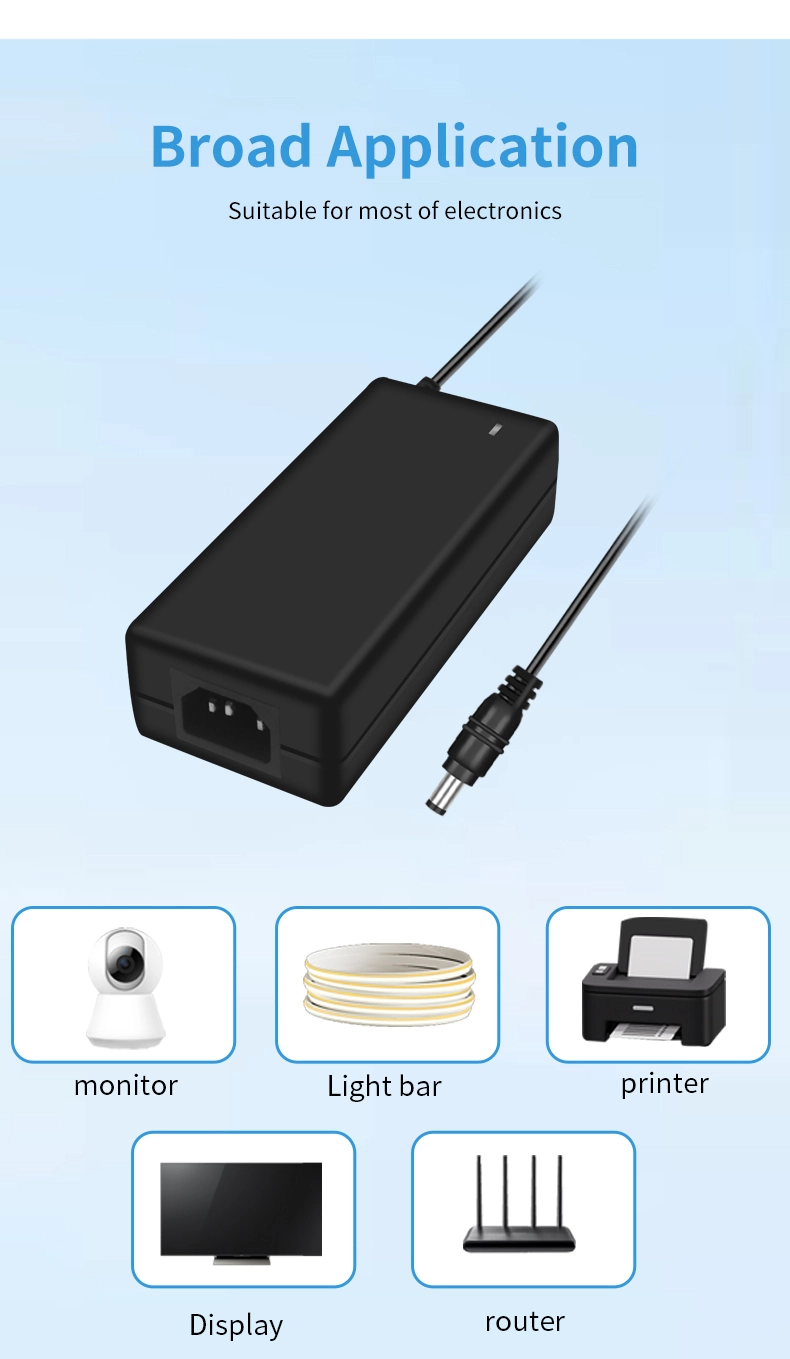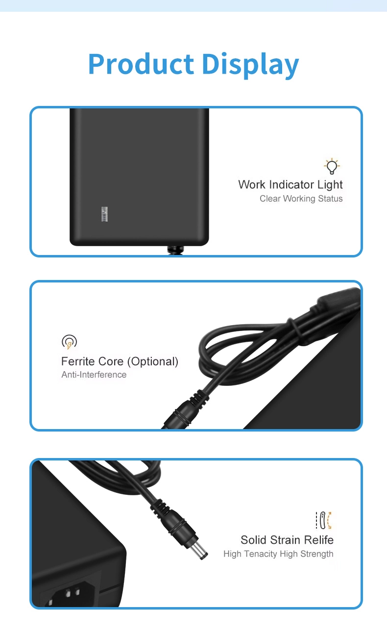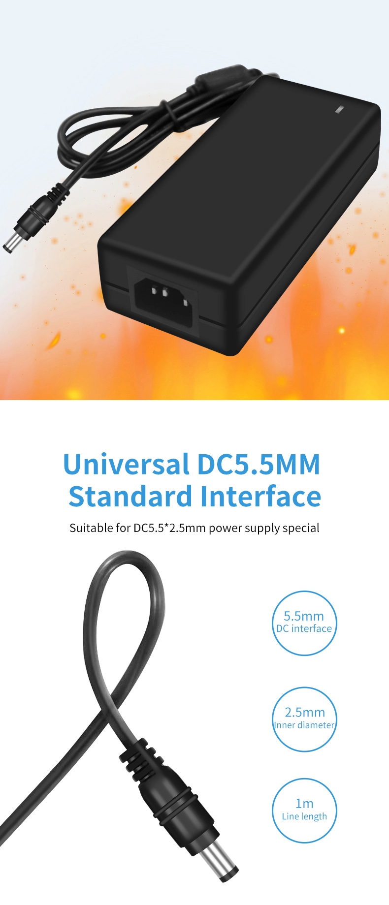 AC 100-240V широк вход за напрежение е съвместим с електрическите мрежи в над 100 страни по света. 1,5 m удължен изходен кабел (диаметър 1,0 mm²), съчетан с въртящ се на 180° DC конектор, се адаптира към различни сценарии на инсталиране. С компактен размер от само 120 × 60 × 30 mm, той е 35% по-малък от традиционните адаптери със същата мощност, тежащ само 280 g - подобрявайки преносимостта с 50%.