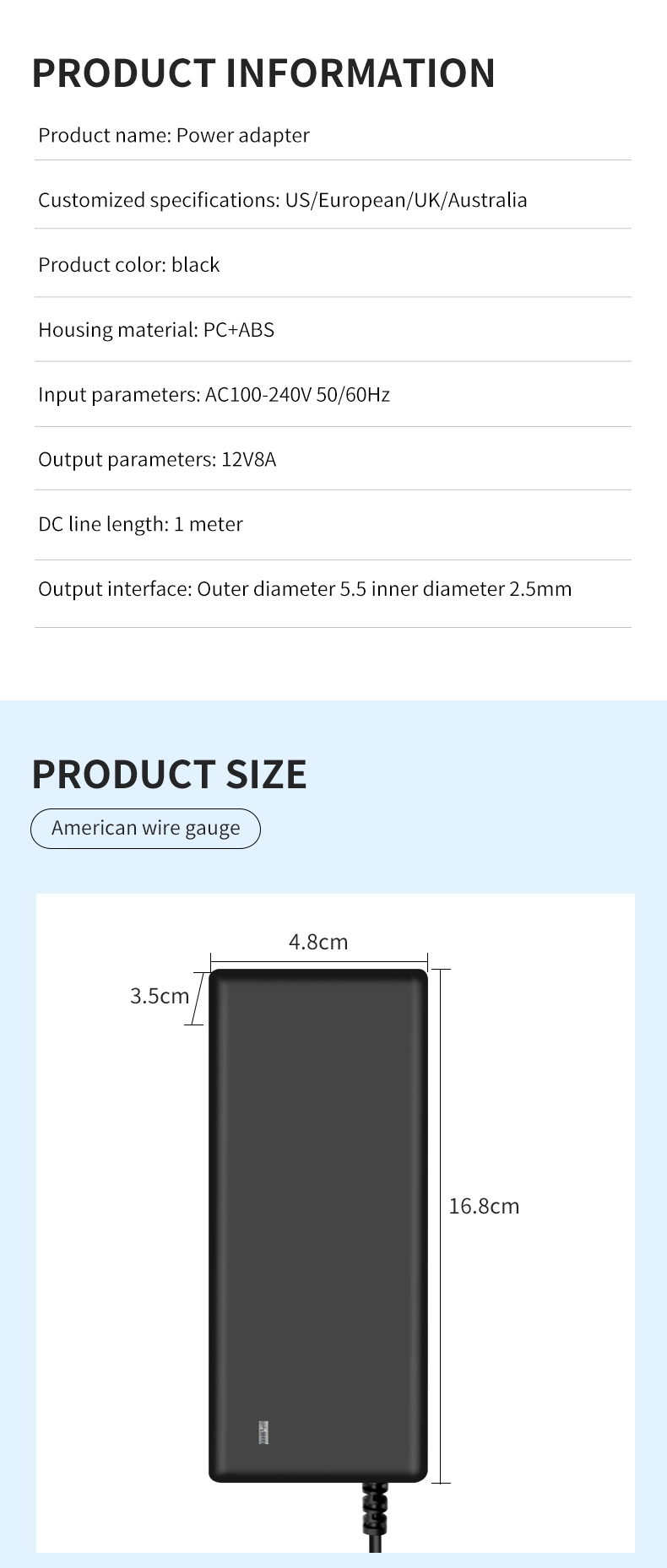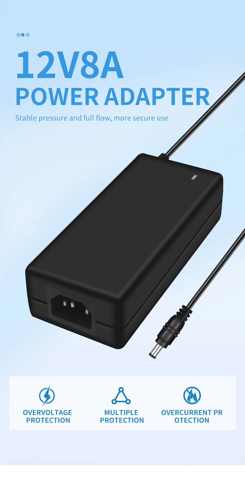 С номинална мощност от 96 W, изходният ток на захранващия адаптер от 96 W се стабилизира при пик от 8 A, а точността на напрежението се контролира в рамките на ± 5% (напрежение на празен ход: 12,1 V; напрежение при пълно натоварване: 11,8 V). Може да отговори на нуждите от едновременно захранване на множество устройства (напр. 2 паралелни 48W устройства). Изходният кабел с чисто медно ядро осигурява спад на напрежението от ≤0,3 V, поддържайки незатихваща производителност по време на предаване на висок ток.