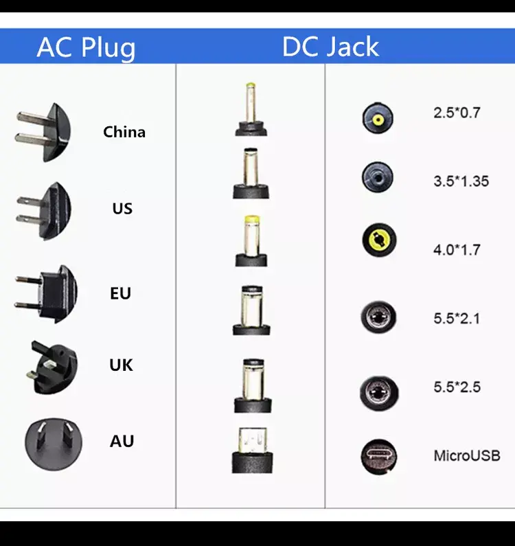 Тип конектор: Стандартен DC варелен конектор (често срещаните размери включват 5,5 mm × 2,1 mm или 5,5 mm × 2,5 mm, персонализирани въз основа на изискванията на устройството).