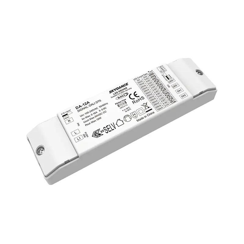 Фабричният висококачествен 12W постоянен ток DALI димируем светодиоден драйвер на STARWELL е високоефективно ядро за интелигентни осветителни системи, съвместимо с глобалните DALI протоколи и 100-240V AC широк вход. Димируемият светодиоден драйвер DALI осигурява стабилен постоянен изходен ток (100-900 mA регулируем) с ±5% точност, осигурявайки постоянна яркост в осветителните тела. С технологията за затъмняване T-PWM, той постига 0,0001%-100% ултра-дълбоко затъмняване без трептене, отговаряйки на стандартите IEEE 1789 за комфорт на очите. С PF>0,95 и до 87% ефективност, той намалява загубата на енергия, докато IP20 защитата и -20~50℃ работен температурен диапазон са подходящи за жилищни, търговски и промишлени сценарии.