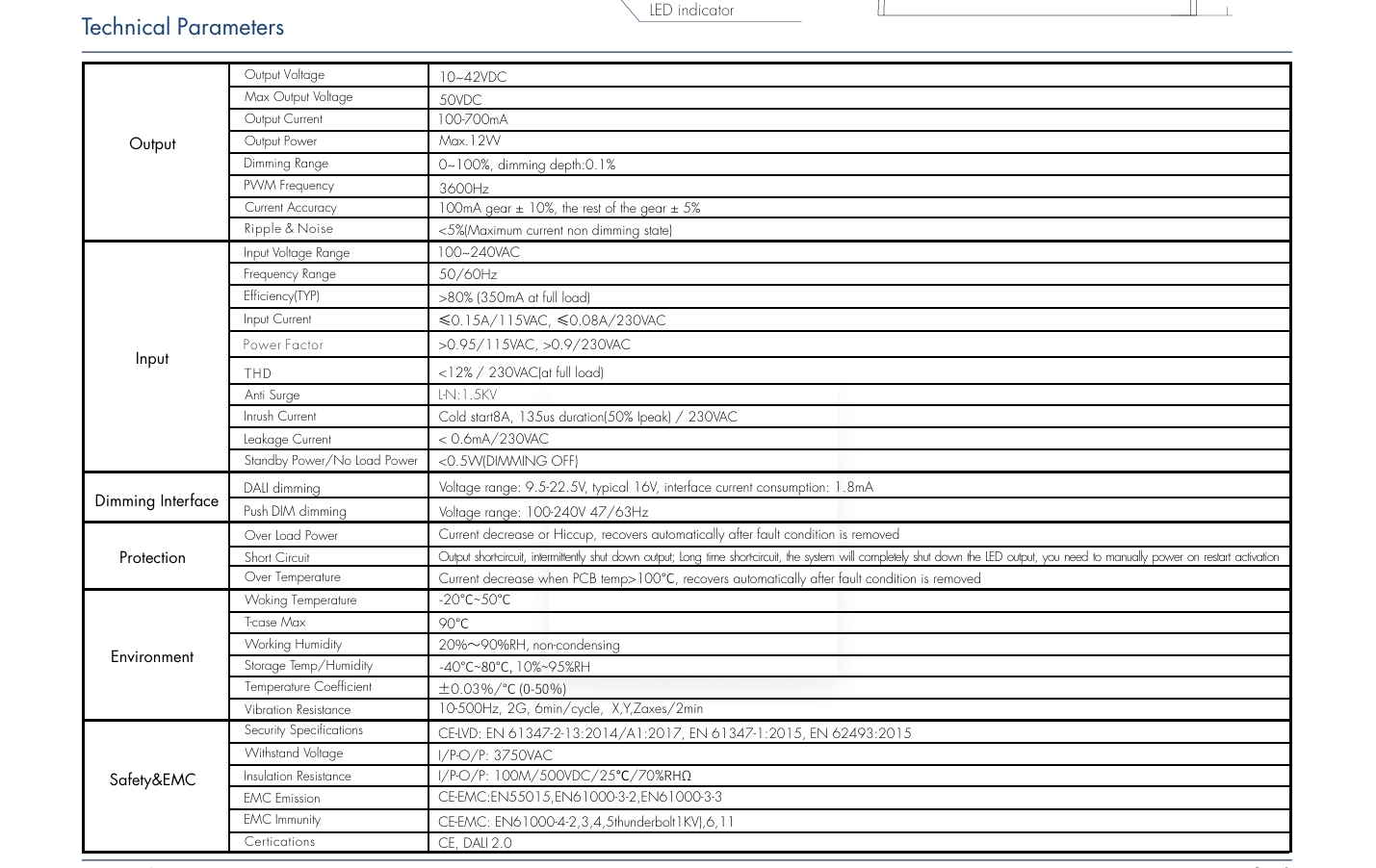 Интелигентна защита и издръжливост: Оборудван със защити от пренапрежение, претоварване, късо съединение и прегряване (задействане от 110 ℃); 100 000 часа живот при 75 ℃.
