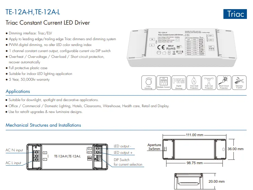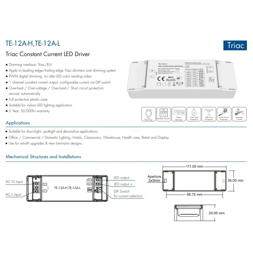Starwell висококачествен 12W триак димиращ светодиоден драйвер с постоянен ток интегрира функции за защита от пренапрежение, свръхток и късо съединение и разполага с висок фактор на мощността и ниско хармонично изкривяване, отговаряйки на множество международни стандарти за енергийна ефективност и безопасност. Компактният му дизайн го прави лесен за инсталиране и подходящ за различни сценарии за вътрешно осветление, като надолу осветителни тела, прожектори и декоративни светлини, което го прави идеално решение за стимулиране на енергоспестяващи ремонти и приложения за интелигентно осветление. ПродуктХарактеристики: