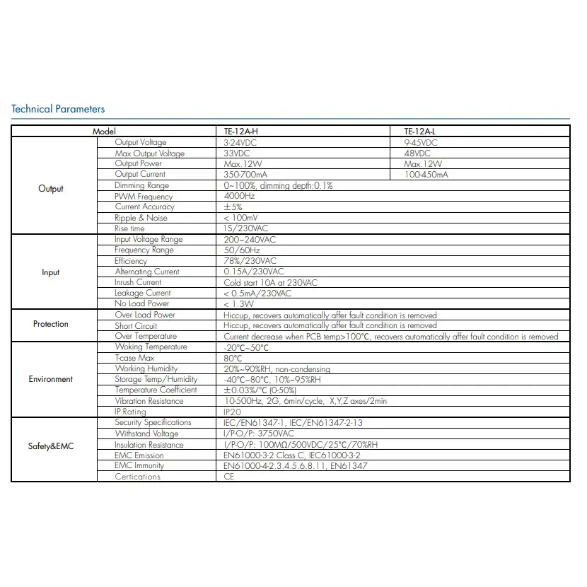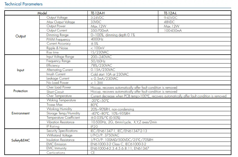 Входно напрежение: 200-240VAC 50-60Hz Входящ ток:0.15A Изходна мощност: 12 вата макс Изходно напрежение:9~42V Гаранция: 2 години Сертификат: CE/Rohs
