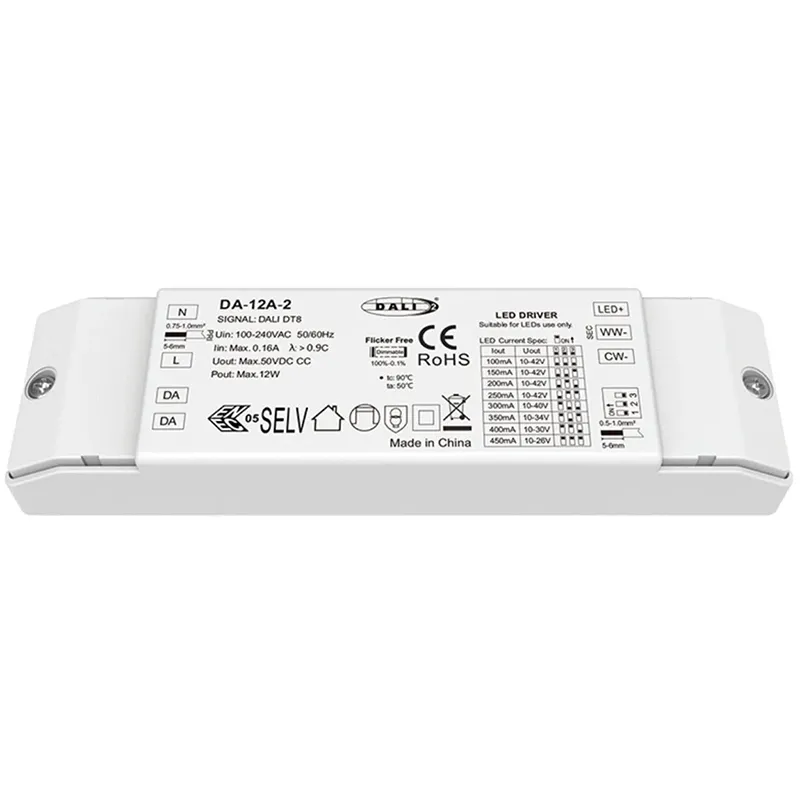 Този постоянен ток DALI CCT димируем светодиоден драйвер разполага с усъвършенстван двоен DALI интерфейс и поддържа стандартизирания DALI-2 DT8 протокол. Той позволява не само плавно 10%–100% затъмняване, но и независимо линейно регулиране на цветовата температура (CCT) от 2700K до 6500K. Чрез унифицирана DALI система, потребителите могат да програмират сцени с динамично осветление – от хладна дневна светлина за фокусиране до топло бяло за релаксация – осигурявайки максимална гъвкавост и интелигентен контрол на осветлението за търговски и жилищни приложения от висок клас.