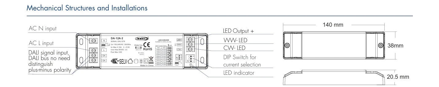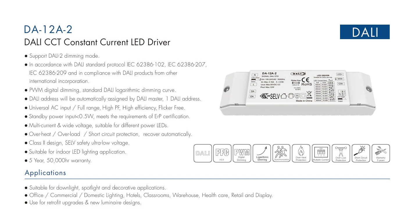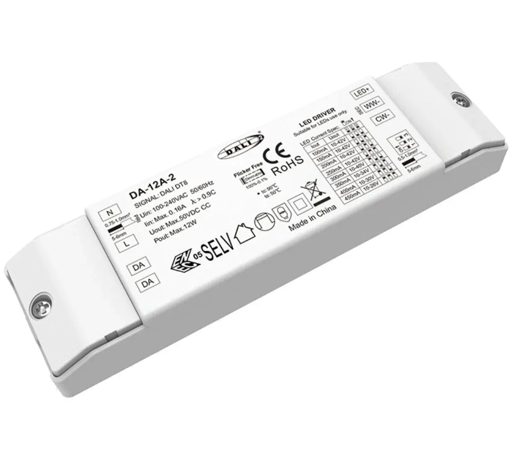 Поместен в компактен корпус IP20, този димируем LED драйвер опростява инсталирането дори в ограничени пространства като LED профили или корпуси на осветителни тела. Чрез комбиниране на изход с постоянен ток, широка настройка на CCT и стандартна DALI-2 съвместимост, той служи като идеален и надежден драйвер за регулируеми бели осветителни тела, линейни осветителни тела и архитектурно осветление – безпроблемно интегриране в модерни екосистеми за интелигентно осветление като универсален DALI CCT димируем LED драйвер с постоянен ток.