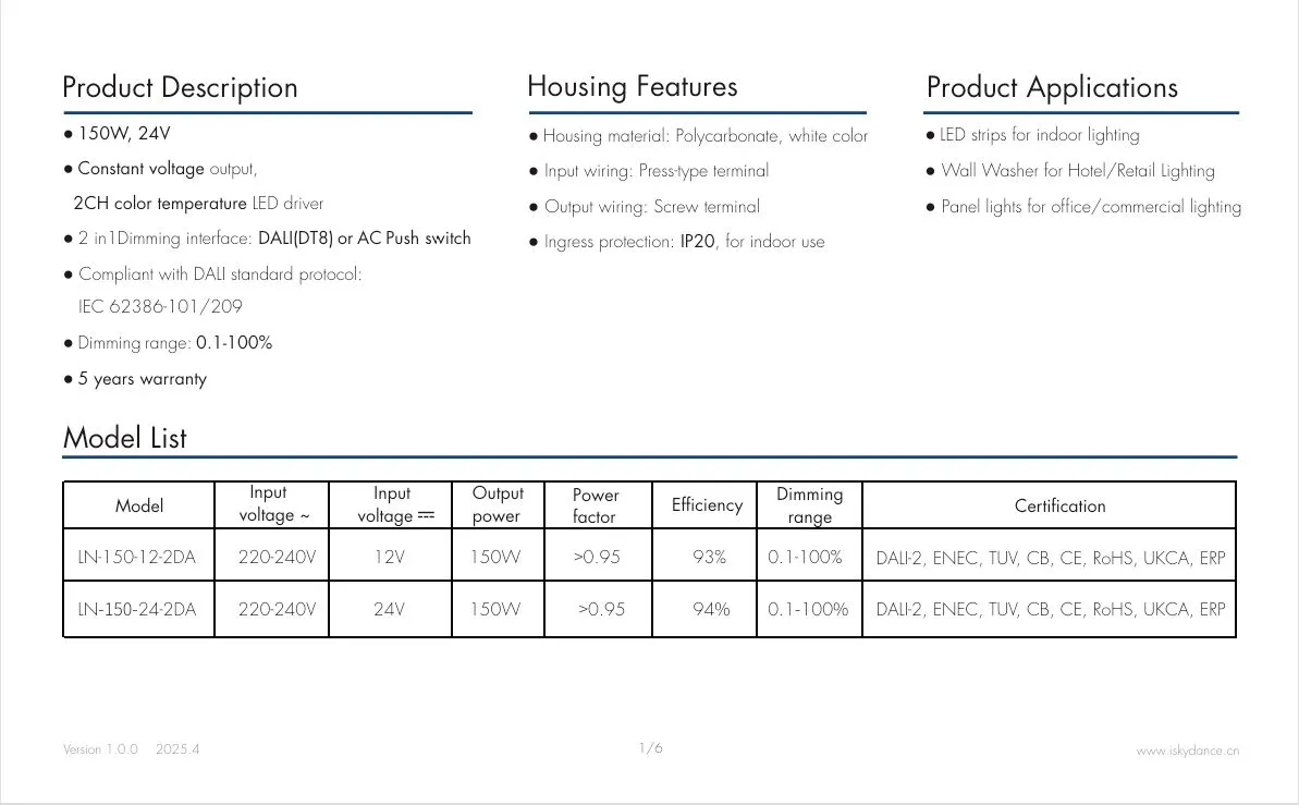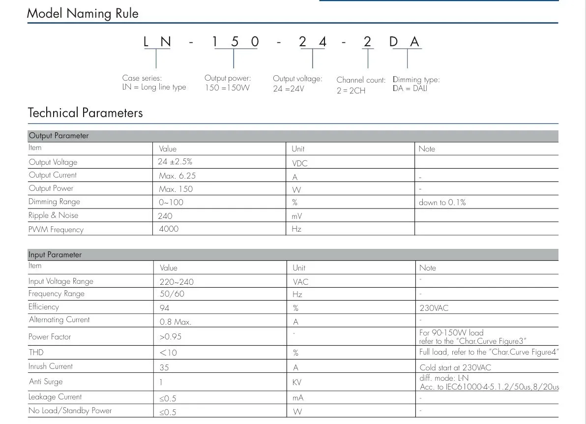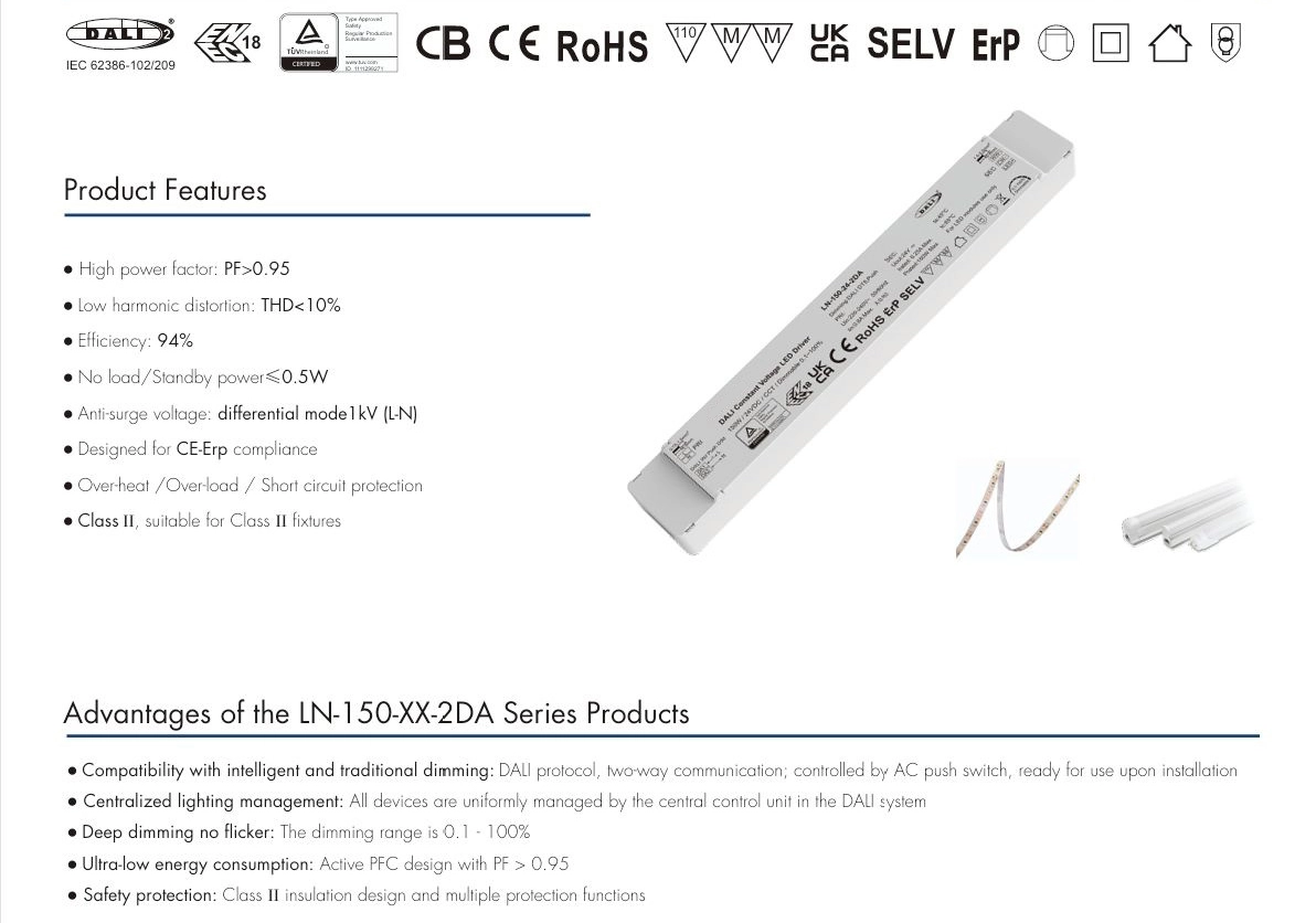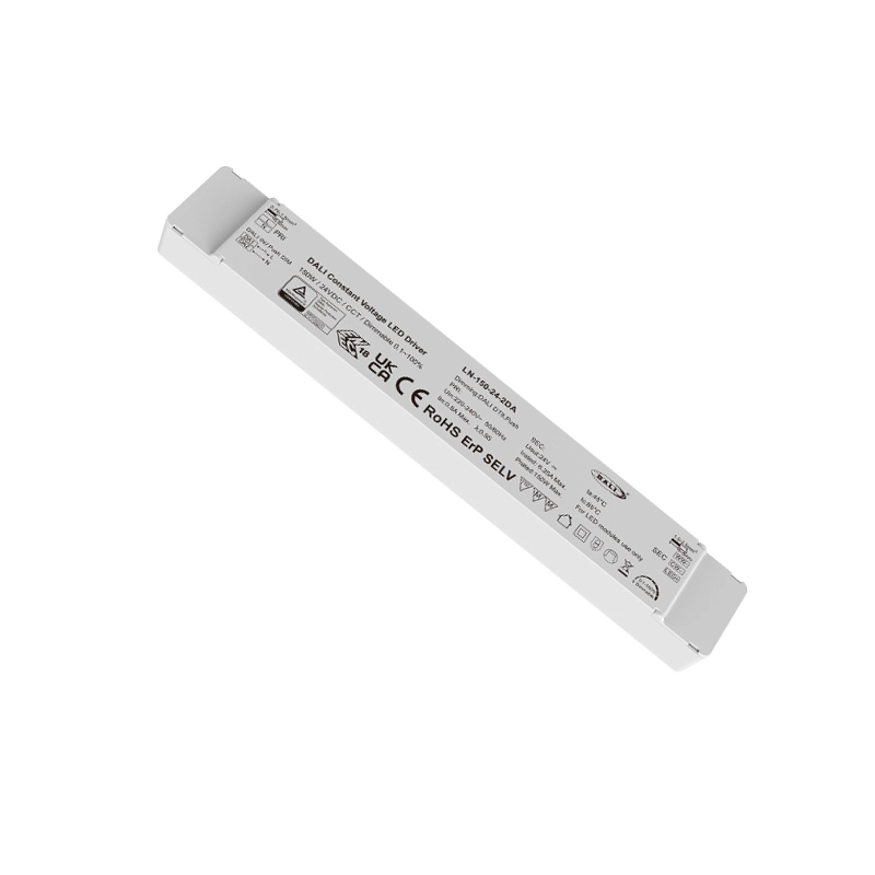 Двойна изолация: 150W 24V DALI CCT LED драйвер с постоянно напрежение се състои от основна изолация и допълнителна изолация, образувайки два независими слоя на изолационна защита, дори ако единият слой се повреди, другият слой може да предотврати токов удар