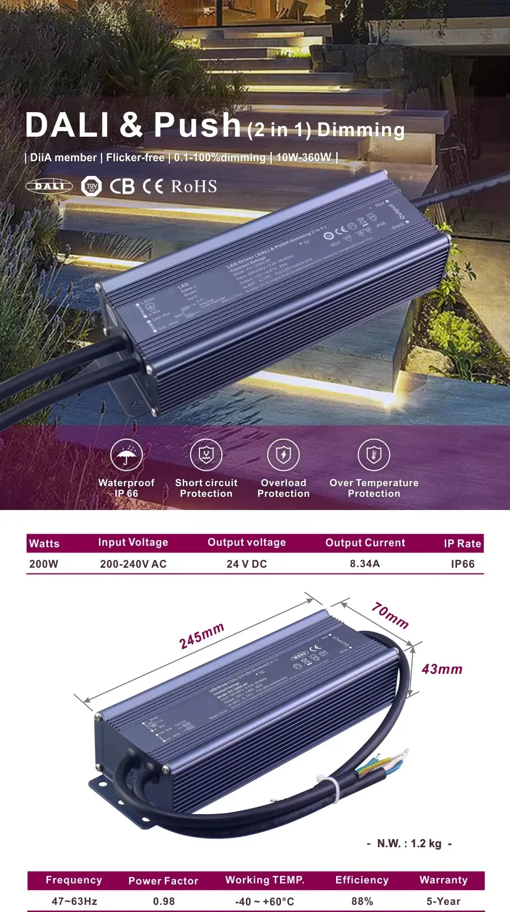 Нашият драйвер отговаря на строги международни сертификати (CE, CB, TUV, RoHS) и е подкрепен от стабилна 5-годишна гаранция, гарантираща дългосрочна производителност и цялост на проекта.