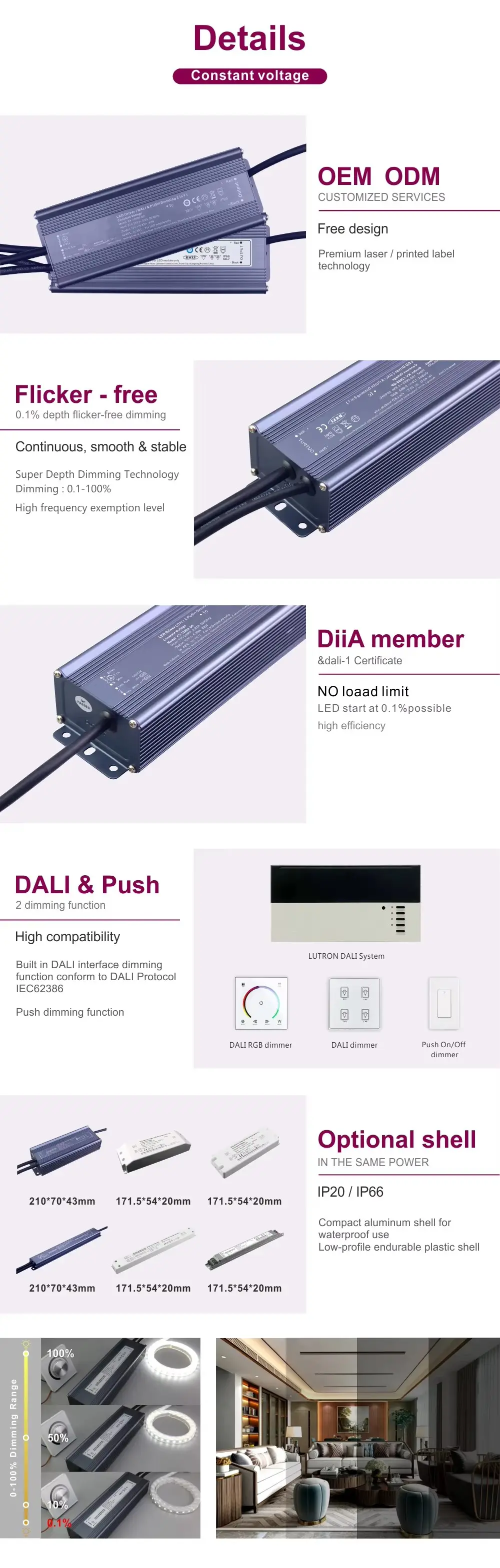 Насладете се на абсолютна стабилност на светлината с гарантиран изход без трептене, от съществено значение за офиси, магазини и здравни заведения. Постигнете несравнимо създаване на атмосфера с ултра-гладък диапазон на затъмняване от 0,1% до 100%, позволяващ безпроблемни преходи от живо осветление за задачи към фино атмосферно сияние.