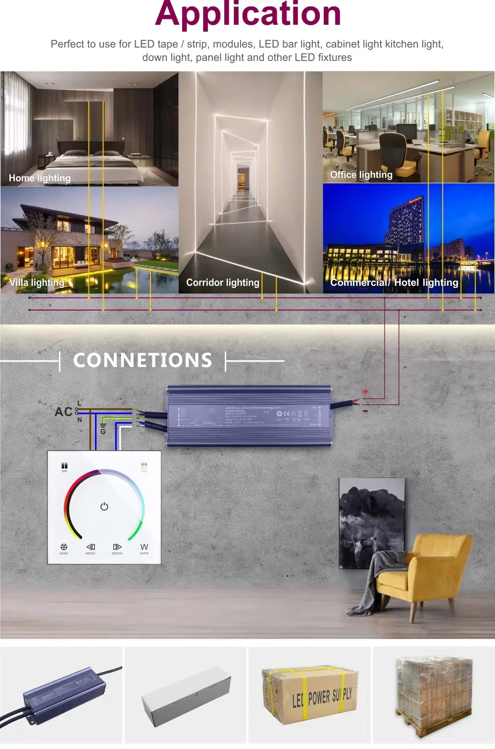 Предлага се от 10 W до 360 W, този драйвер с постоянно напрежение надеждно захранва дълги серии от LED лентови светлини, модули и линейни тела. Той е идеалният избор за: