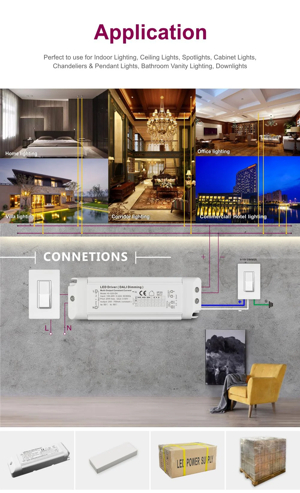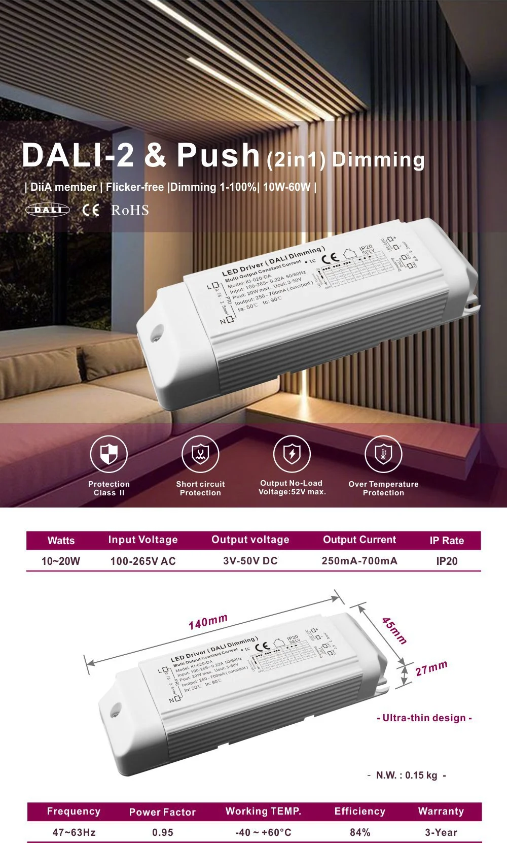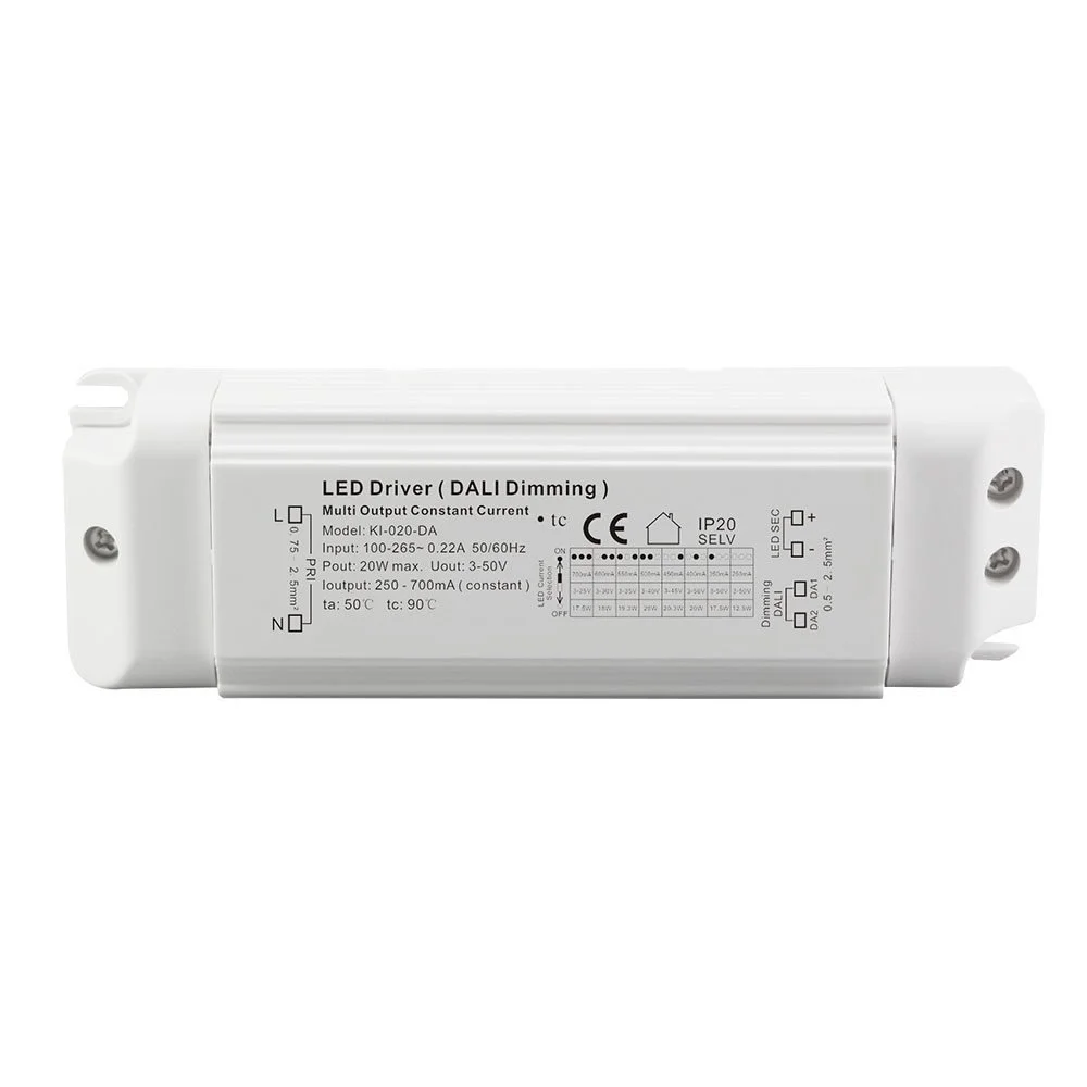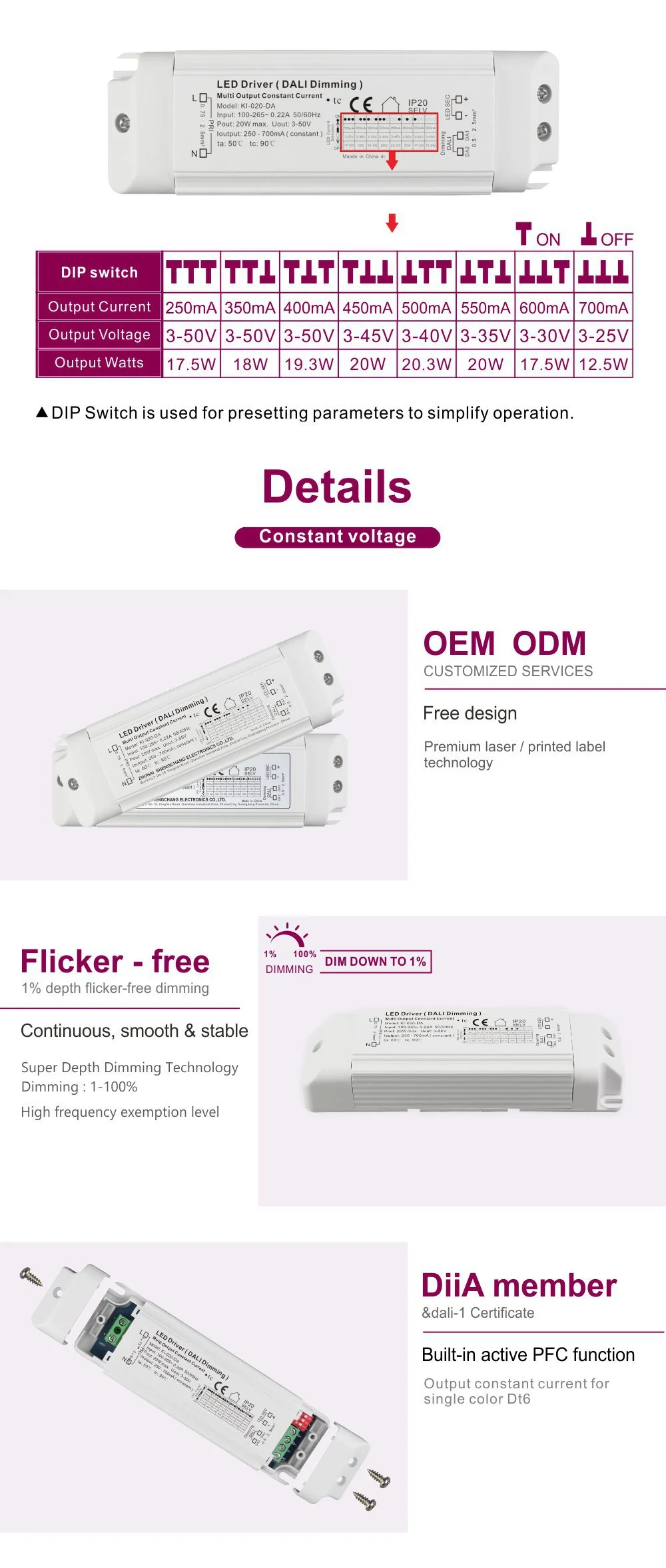Като надеждно 20W димиращо захранване с постоянен ток на Dali за LED светлини, то гарантира осигуряването на чист постоянен ток без трептене за LED модули или светлинни ленти. Корпусът на продукта използва димируем 20W LED драйвер AC-DC с постоянен ток пластмасов корпус за LED осветление, включващ компактна и здрава структура с отлично разсейване на топлината и поддържа както вграден, така и външен монтаж.