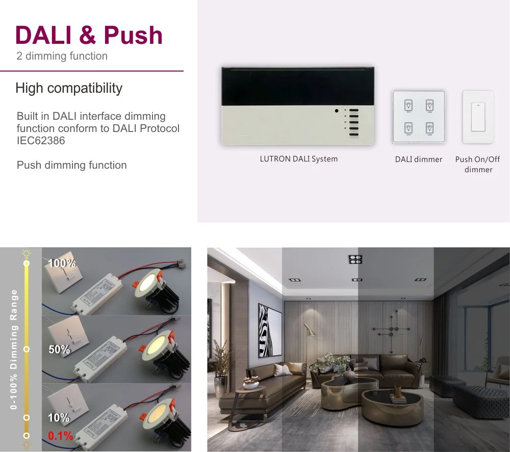 Компактният му дизайн улеснява инсталирането и интегрирането, осигурявайки цялостна защита от пренапрежение, прекомерна температура и късо съединение. Продуктът е подходящ за места като музеи, офиси и хотели, които изискват интелигентно управление на осветлението, базирано на сцени, и е идеално решение за постигане на ефективно енергоспестяване и гъвкаво управление на светлинната среда.