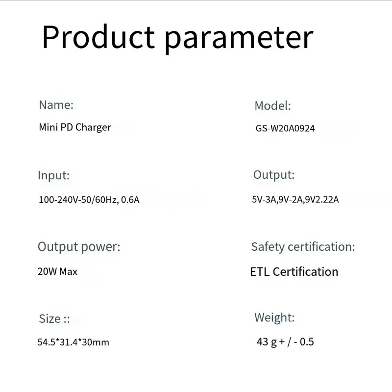 20W версия за Япония щепсел PD зарядно устройство Спецификация: