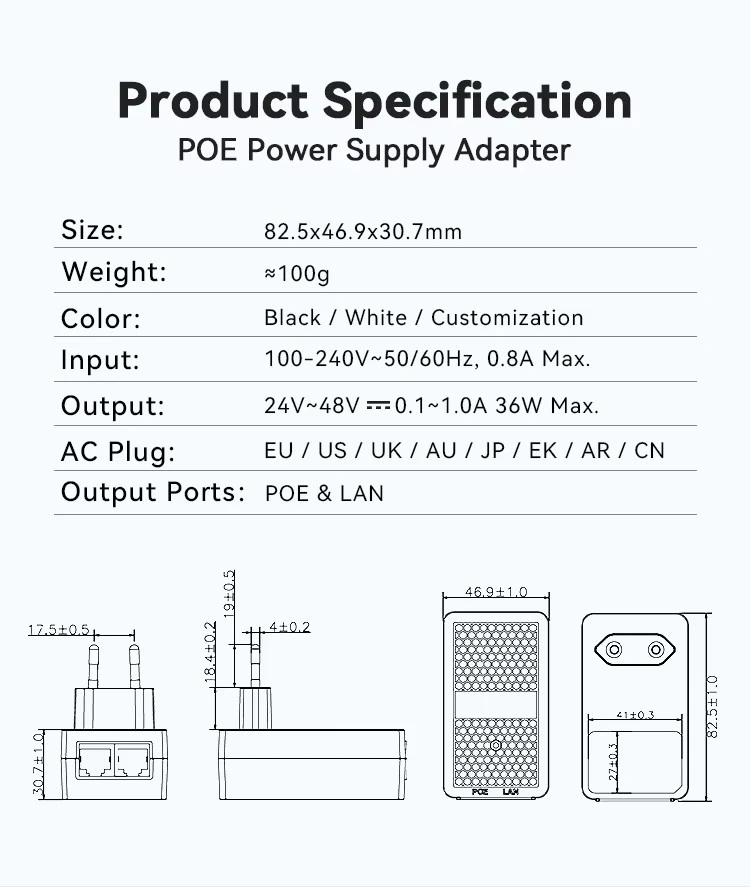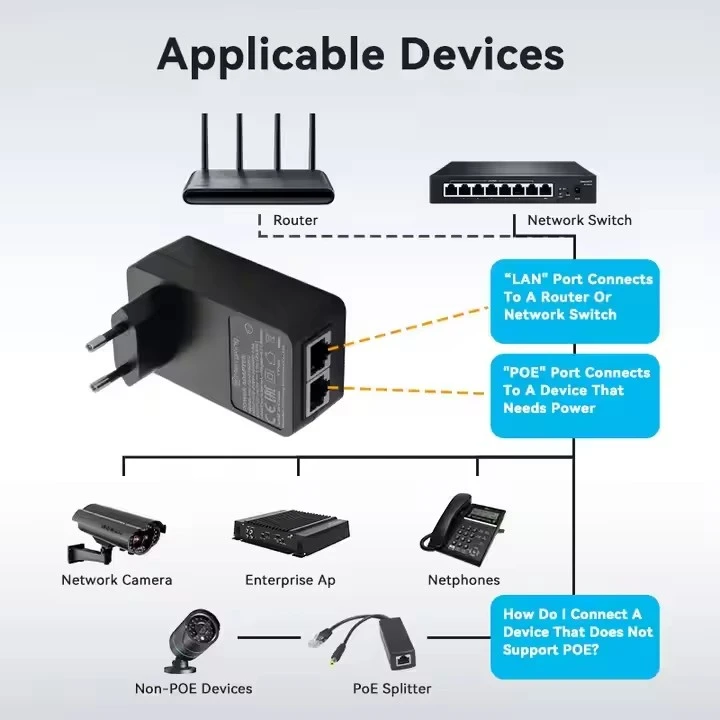 24V 1A монтиран на стена EU Plug POE инжектор на фабриката STARWELL разполага с универсален AC вход (100-240V) с избираеми изходи: 24V/0,5A, 24V/1A или 48V/0,5A. Той поддържа както пасивни, така и активни PoE протоколи, с гъвкави назначавания на щифтове, включително Midspan (4,5+/7,8-) и Endspan (1,2+/3,6-). Напълно съвместим със стандартите IEEE802.3af/at/bt PoE++, той предоставя изключителни възможности за скорост на данни, вариращи от 10/100/1000M до 2.5G/5G/10G bps.