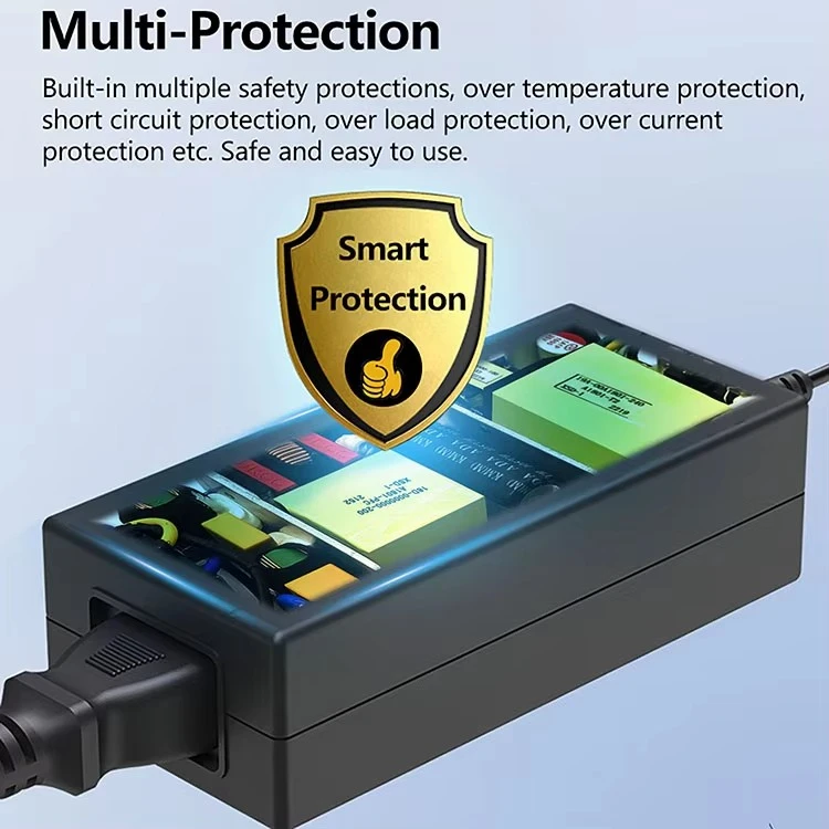 Издръжливият 24V 7,5A универсален настолен захранващ адаптер Starwell се характеризира с висока ефективност на преобразуване, минимални вълни и шум и отлично регулиране на напрежението при различни натоварвания. Корпусът осигурява ефективно разсейване на топлината и издръжливост. Изчерпателните вериги за защита предпазват от пренапрежение, свръхток, късо съединение и прегряване, повишавайки безопасността на оборудването и потребителите.