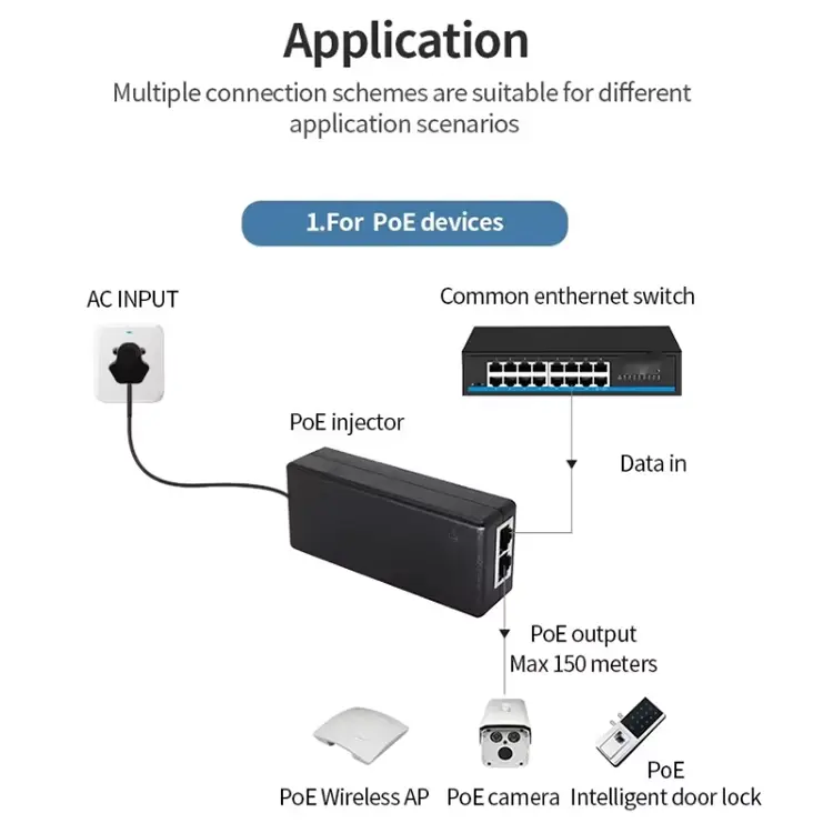 Този пасивен PoE инжектор използва директно предаване на енергия без ръкостискане на протокола, намалявайки сложността на системата и подобрявайки съвместимостта със специфично мрежово оборудване.