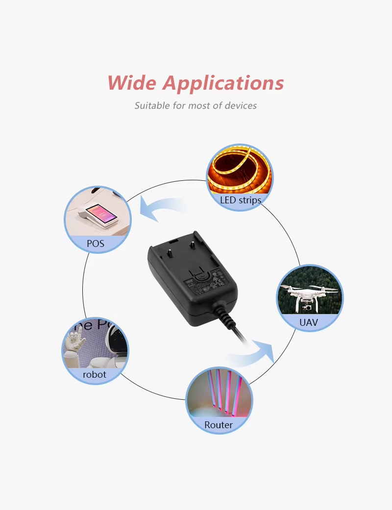 Широка гама от сценарии на приложение: Независимо дали става въпрос за захранване на LED светлинни ленти, интелигентни високоговорители, мрежови рутери или други малки електрически уреди, това мощно захранване със сменяем щепсел Switching е вашият най-идеален и успокояващ избор!
