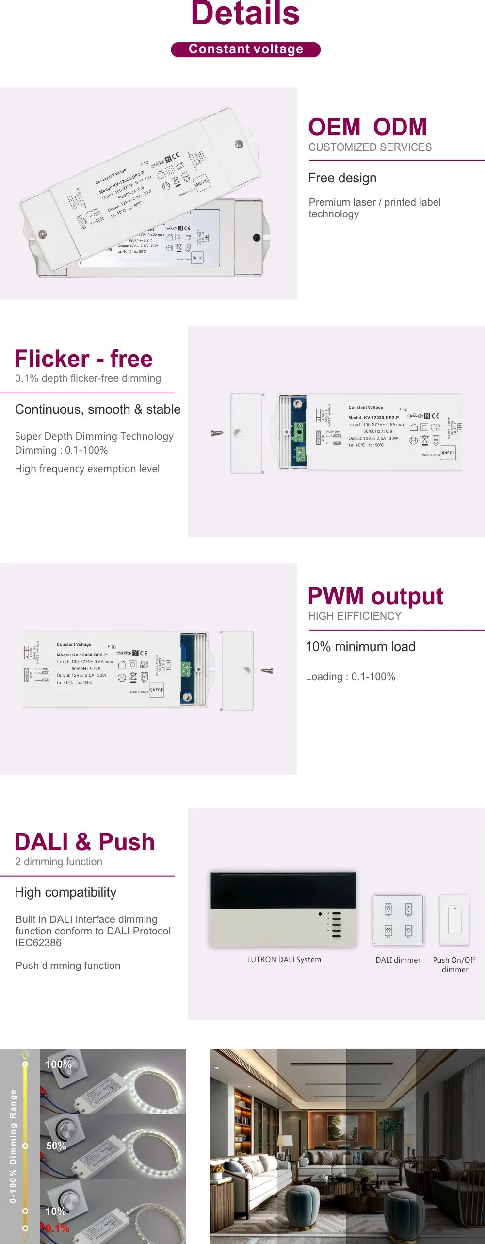 36V постоянно напрежение 30W DALI димируем LED драйвер, със своя стабилен изход за постоянно напрежение, мощна способност за контрол на протокола DALI, висококачествен светлинен ефект без трептене, широка адаптивност на напрежението и надежден сертификат за безопасност, осигурява мощно и интелигентно "сърце" за различни приложения на LED осветление.