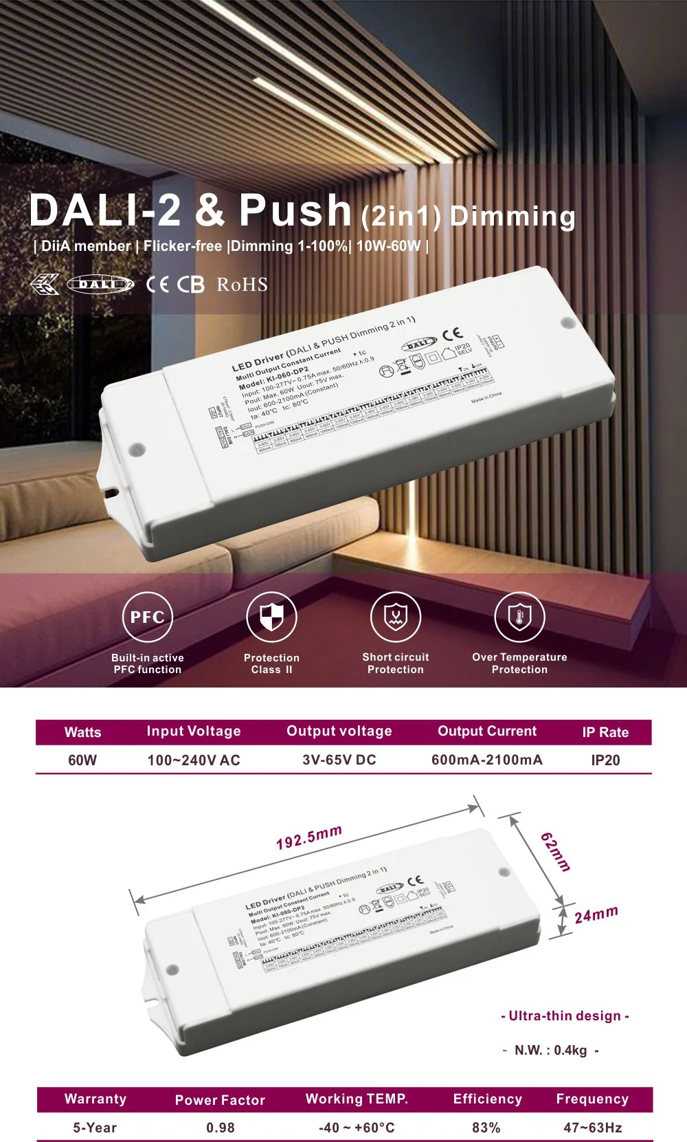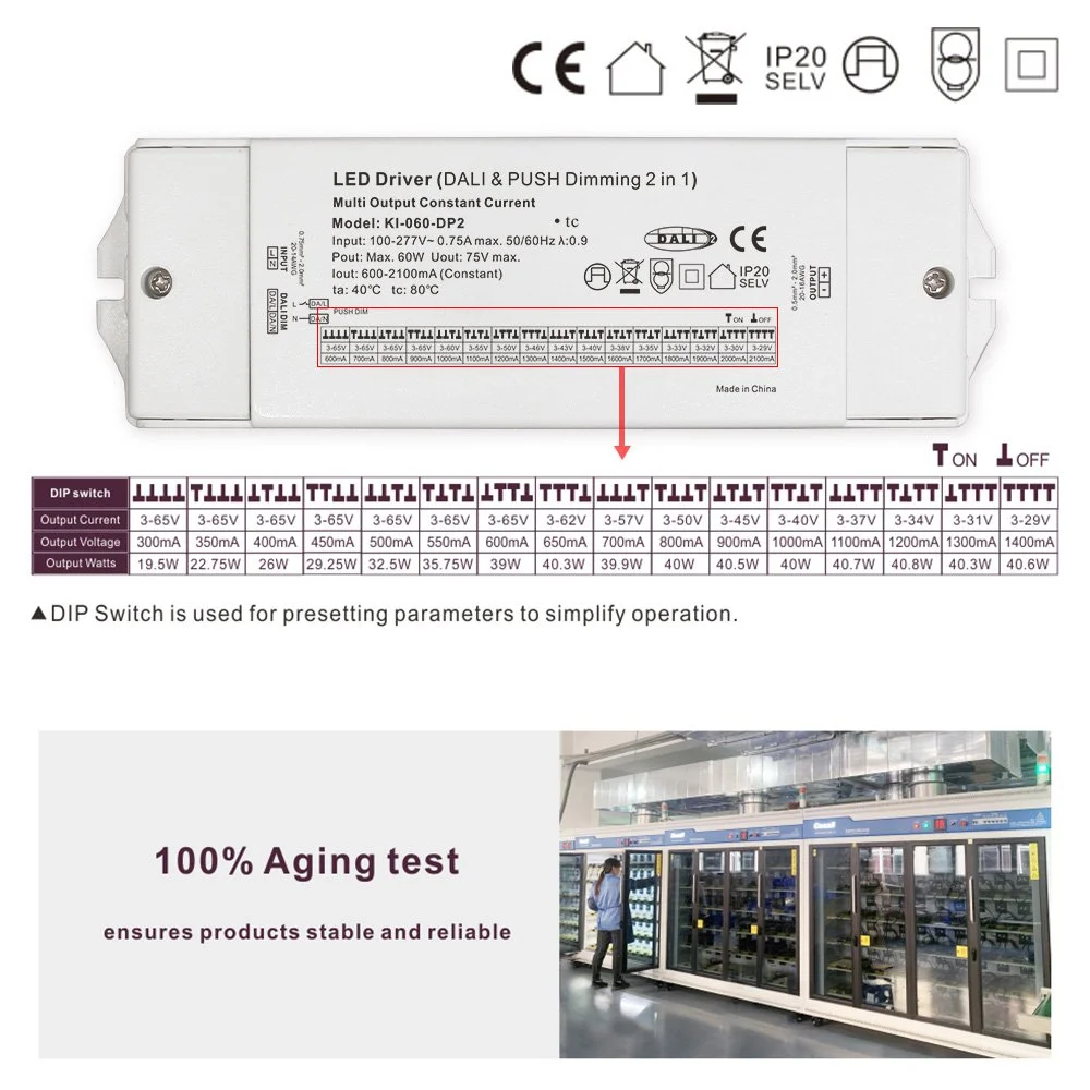 Като драйвер с постоянен ток от 60 W, той използва усъвършенствана технология за управление на постоянен ток със затворен контур, за да гарантира, че изходният ток (типичната стойност е 700 mA, която може да бъде персонализирана според изискванията на LED модула на клиентите) е много стабилен. Този дизайн ефективно избягва затихването на светлината или цветовото отклонение, причинено от текущите колебания в светодиодите, като основно гарантира дългосрочната яркост и експлоатационен живот на лампите. Неговият широк обхват на входно напрежение и постоянни характеристики на изходния ток го правят идеално съвместим с различни спецификации на LED луни, прожектори, панелни светлини, линейни светлини и модули за светлинни ленти.