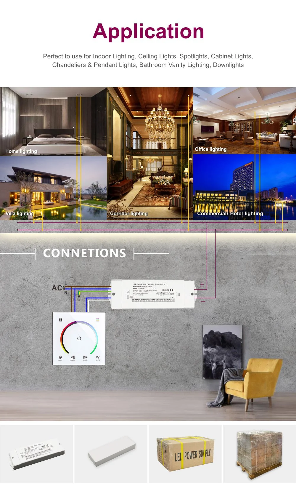 Основният акцент на този драйвер се крие в неговата интеграция на CCT функция за затъмняване. Потребителите могат да извършват непрекъснато линейно регулиране в широк диапазон на цветовата температура от 2700K (топла жълта светлина) до 6500K (студена бяла светлина). Една единствена лампа може да отговори на изискванията на различните времена и дейности за осветителната среда - бяла светлина с висока цветна температура сутрин за ободряване и освежаване и жълта светлина с ниска цветова температура вечер за създаване на топла атмосфера, значително подобрявайки комфорта и функционалността на пространството.