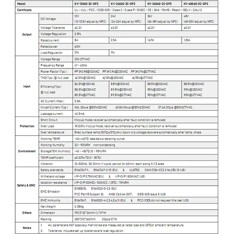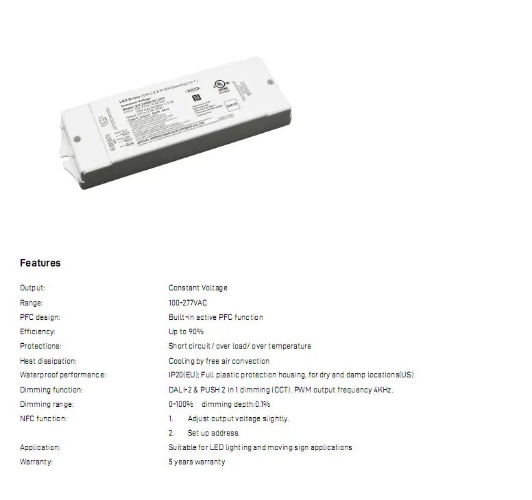 Приемайки DALI цифрово затъмняване, той поддържа 0,1%-100% плавно затъмняване без трептене и прецизно регулиране на CCT от 2700K до 6500K, поддържайки постоянна яркост по време на промени в цветната температура. Вграденият активен PFC повишава ефективността до 88%, с ниска консумация на енергия без натоварване. Разполага с плавен старт, защита от пренапрежение, свръхток и късо съединение, осигуряваща безопасна работа.