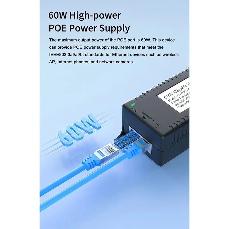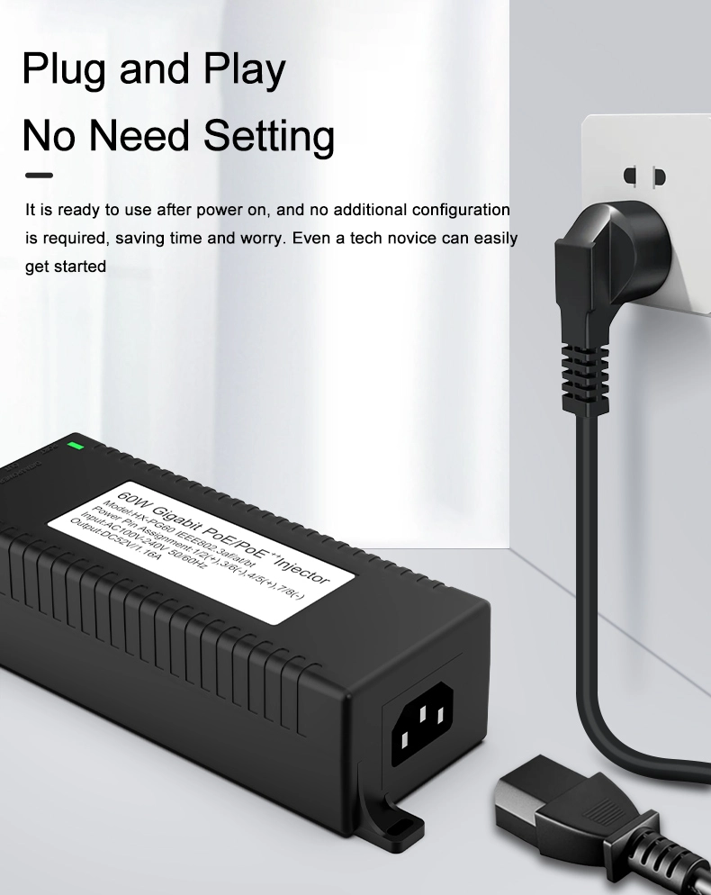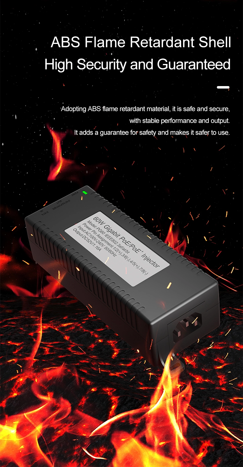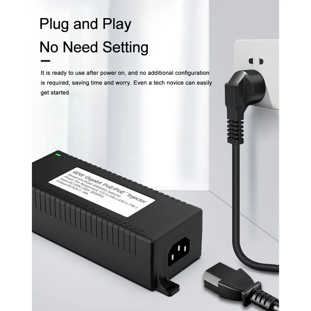 Наблюдение на сигурността: Gigabit 60W настолен POE инжектор за IP камера за сигурност и мрежово устройство осигурява стабилно захранване на IP камери и PTZ камери.
