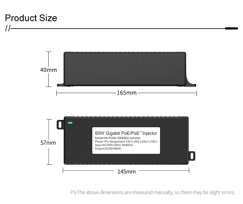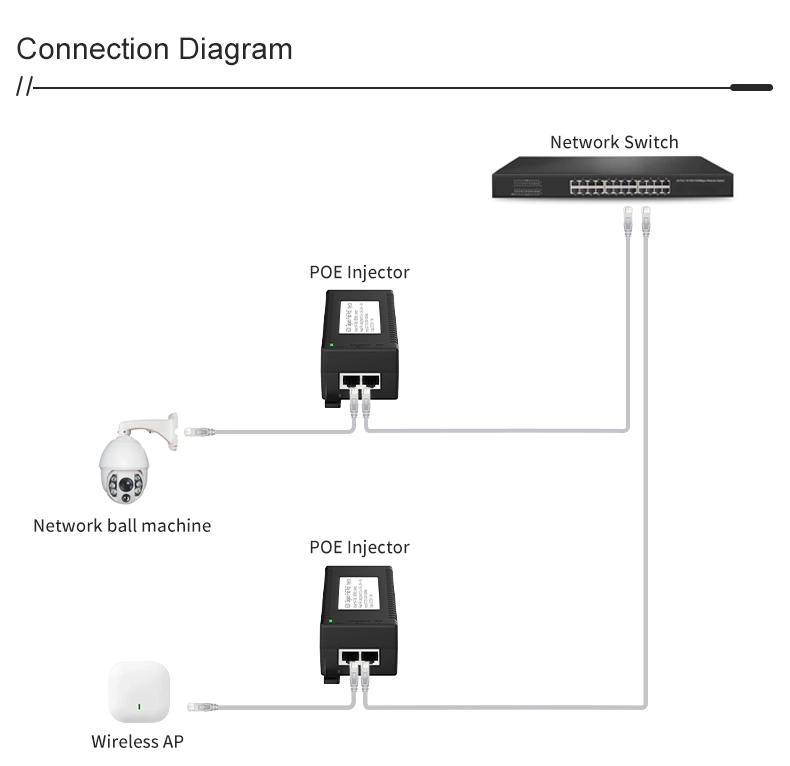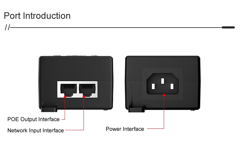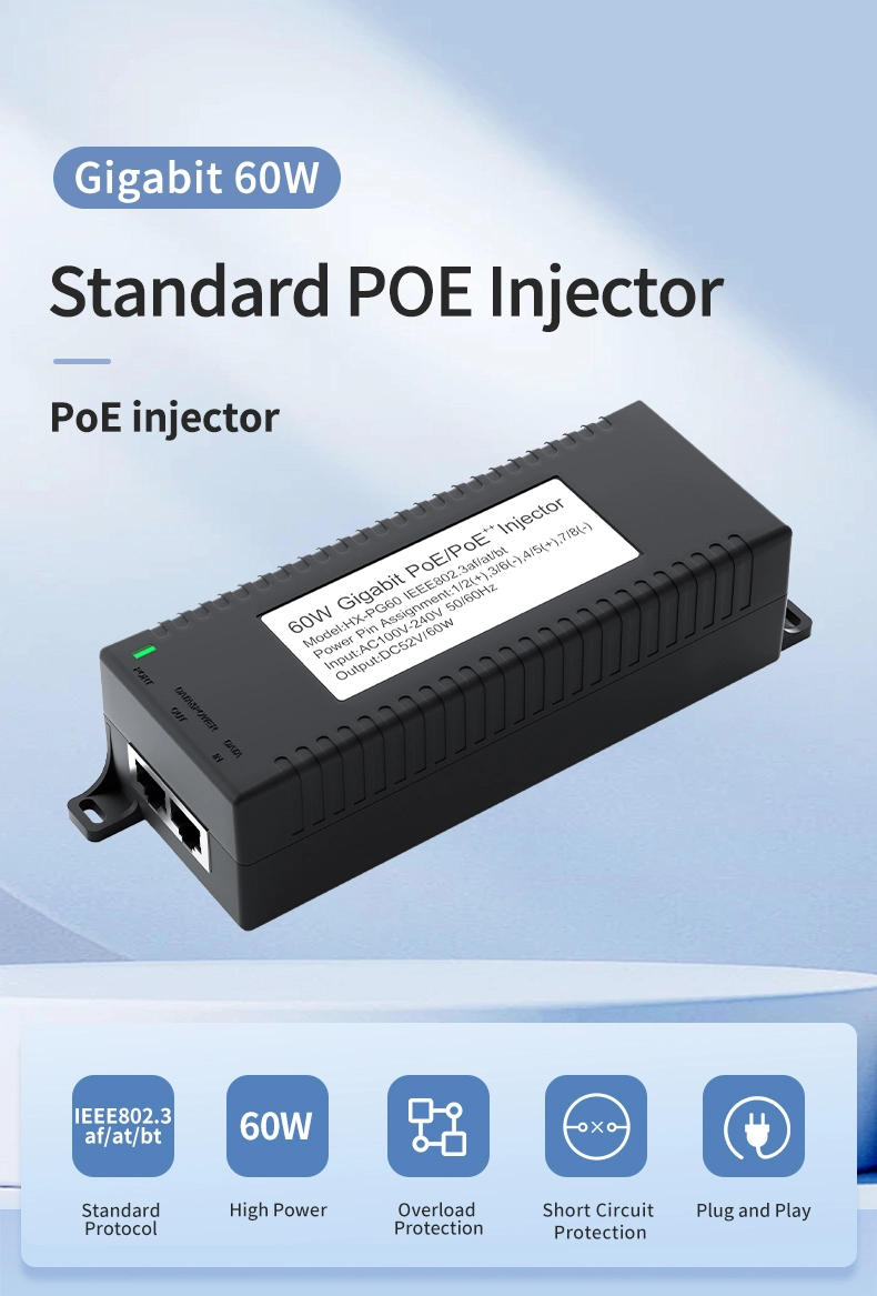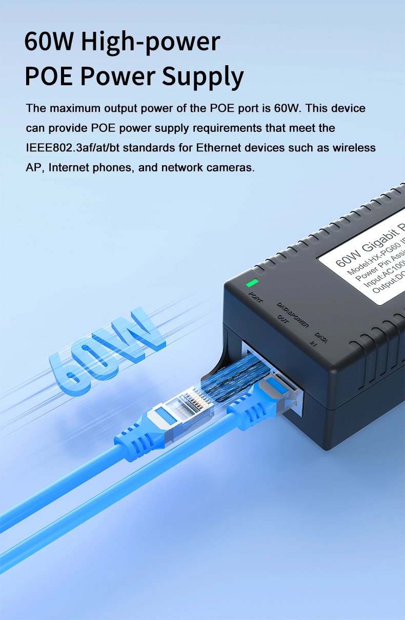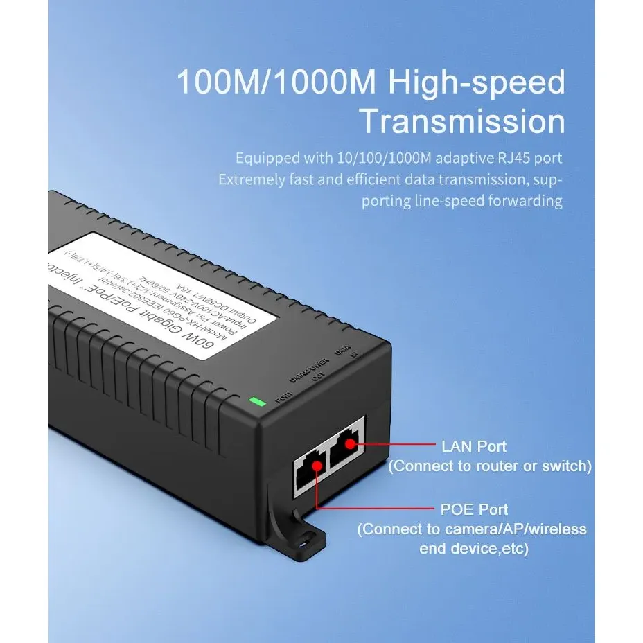 Наблюдение на сигурността: Gigabit 60W настолен POE инжектор за IP камера за сигурност и мрежово устройство осигурява стабилно захранване на IP камери и PTZ камери.
