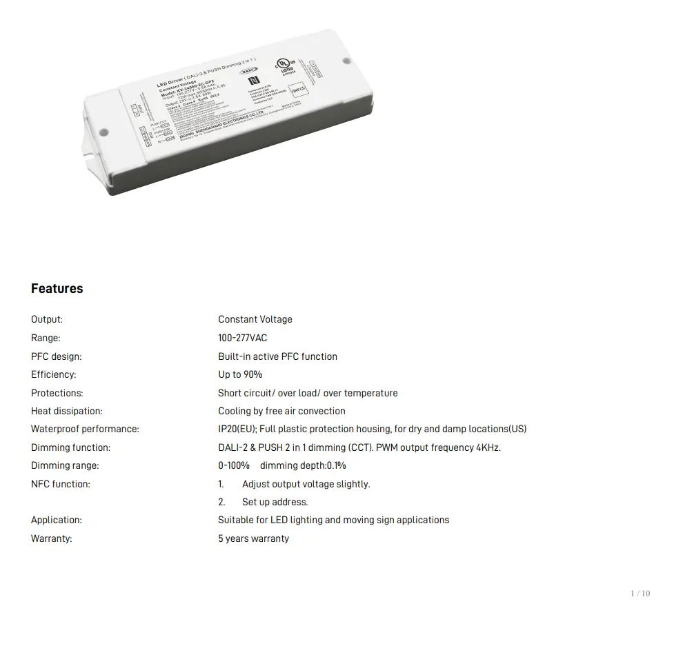 Този тип драйвер позволява на потребителите да регулират яркостта и цветната температура (CCT) плавно от топло бяло до студено бяло, като същевременно поддържат стабилна изходна мощност за LED тела като панели, лентови светлини и долни светлини.