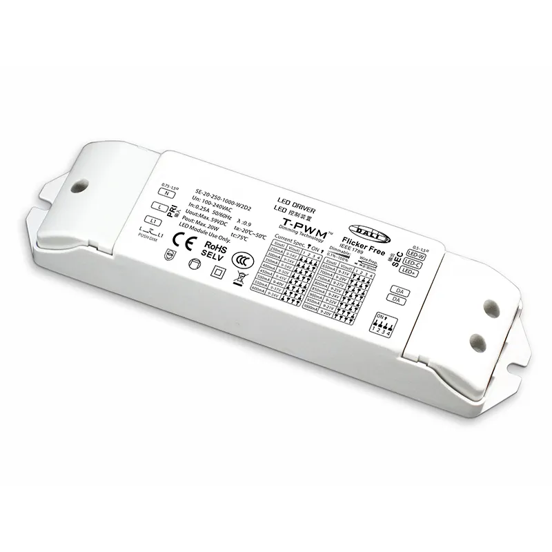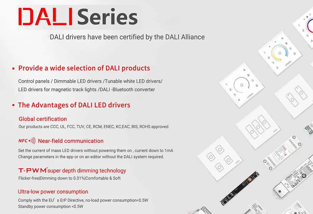 Усъвършенстван DALI димиращ контрол – Позволява цифрово димиране от 0,1% до 100% с висока разделителна способност, поддържайки до 64 DALI адреса за индивидуален или групов контрол в автоматизирани осветителни системи.
