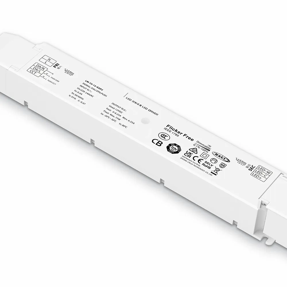 Висококачественият STARWELL 75W 12V постоянно напрежение DALI димируем светодиоден драйвер е високопроизводително захранване, предназначено за професионални LED осветителни системи. Той осигурява стабилен 12V DC изход с максимална мощност от 75W, осигурявайки надеждна работа за широка гама от LED приложения с ниско напрежение, включително лентови светлини, табели и декоративно осветление. С вградена съвместимост с DALI затъмняване, LED драйверът позволява прецизно цифрово управление и безпроблемна интеграция в интелигентни мрежи за осветление.