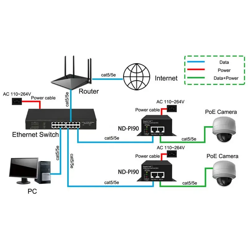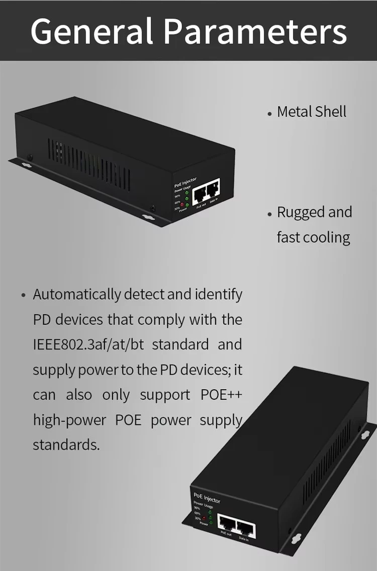 * Съвместим с класификацията на стандартния протокол IEEE802.3bt Class 8. * Намалете търсенето на обемисти захранващи адаптери и кабели и по-ниски разходи за окабеляване. * Широк диапазон на входно променливотоково напрежение от 100-240V. * Поддържа мрежова честотна лента от 10/100/1000Mbps.
