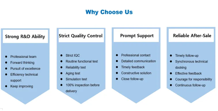 Нашите продукти стриктно се съобразяват с международните стандарти и високите индустриални стандарти от дизайна до проверката до масовото производство и отговарят на международните стандарти като CE, FCC, RoHS, ETL и др., за да гарантират съвместимост и съответствие на световния пазар.