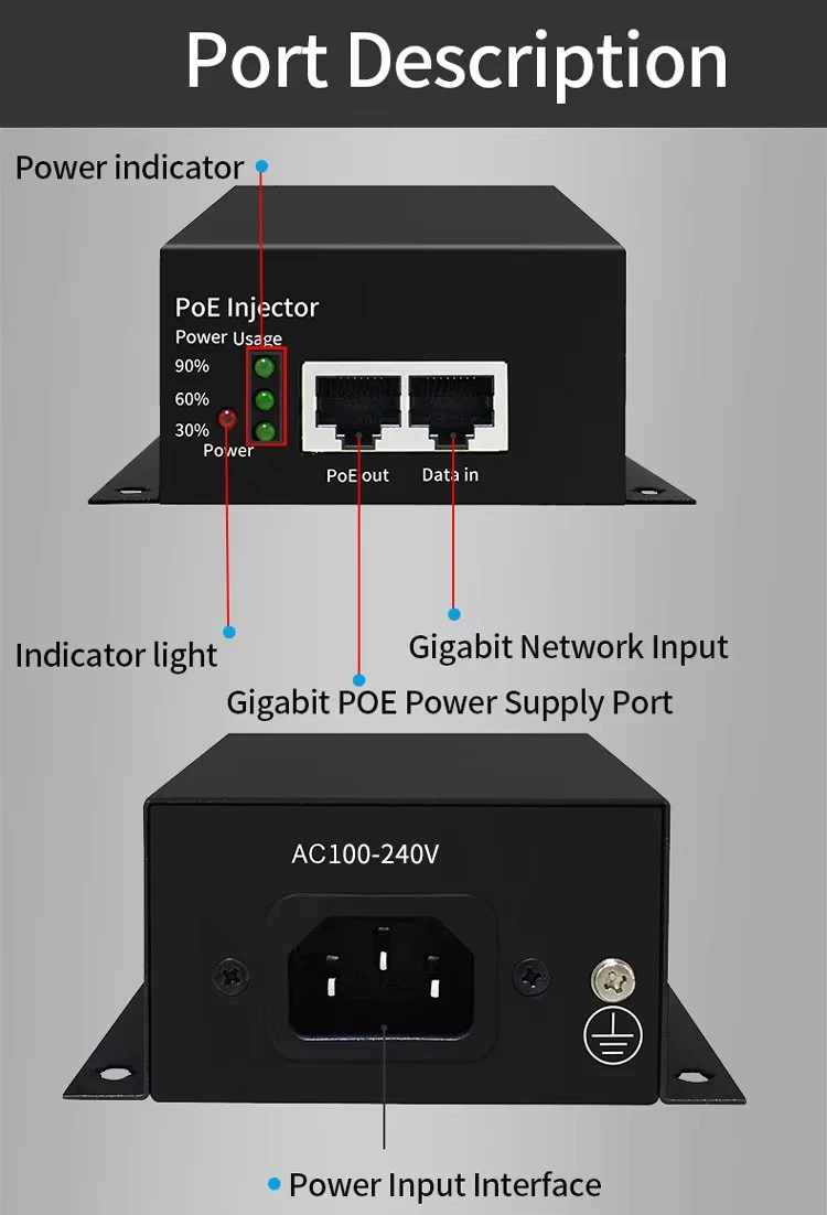 Надеждна мощност С обхват на входното напрежение от AC100-240V и стабилен изход DC48V1.25A, захранваният с батерии POE инжектор осигурява чисто и постоянно 48V PoE захранване към свързани устройства. Той поддържа конфигурацията на ядрото на захранващата линия 1/2,4/5(+) и 3/6,7/8(-), осигурявайки широка съвместимост с различни PoE захранвани устройства в приемащия край.