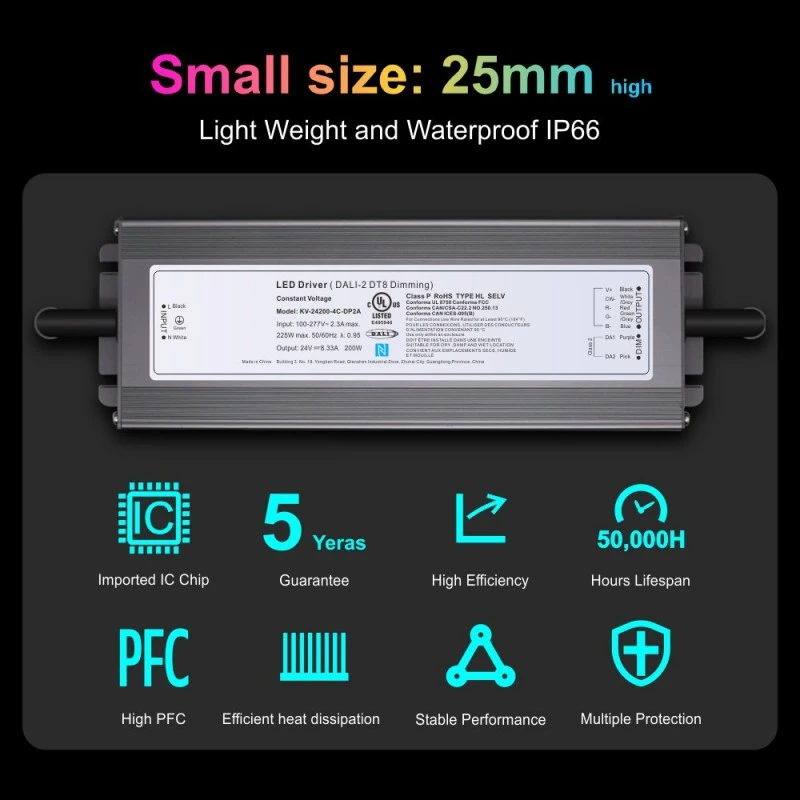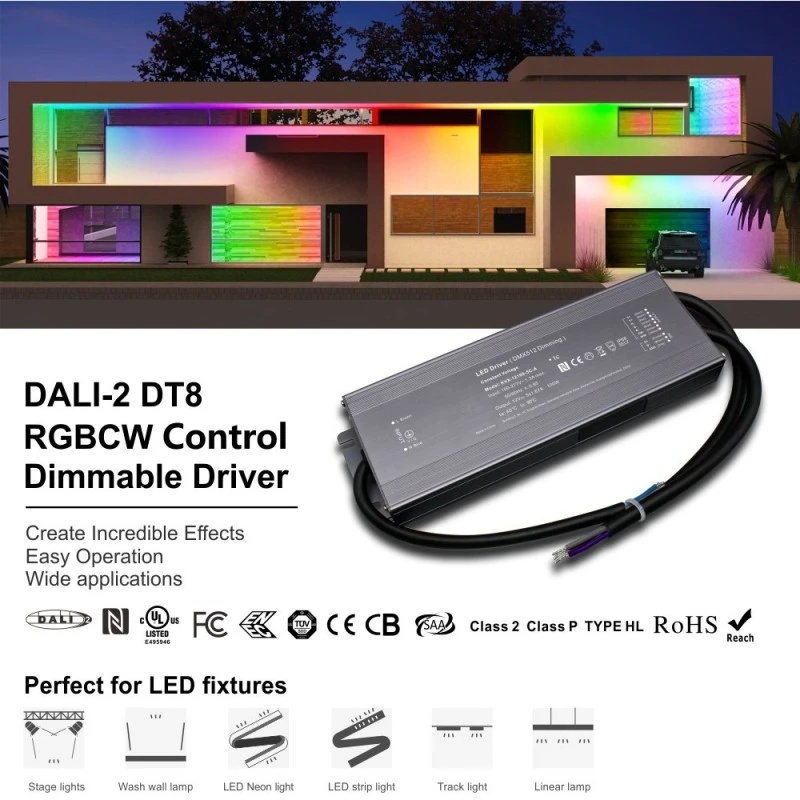 Този продукт е DALI постоянно напрежение 200W CCT димируем светодиоден драйвер, представляващ усъвършенствано решение за управление на осветлението в търговско и интелигентно жилище от висок клас. Като основен компонент, напълно съвместим със стандарта DALI 2 DT8 Dimmable 200W LED Driver, той не само позволява плавно и безстепенно регулиране на яркостта, но също така, чрез разширения протокол DT8, предлага прецизно и цифрово управление на цветовата температура (CCT) и равномерния цвят (RGB) светлина, предоставяйки на дизайнерите безпрецедентни динамични възможности за създаване на светлина и сенки.