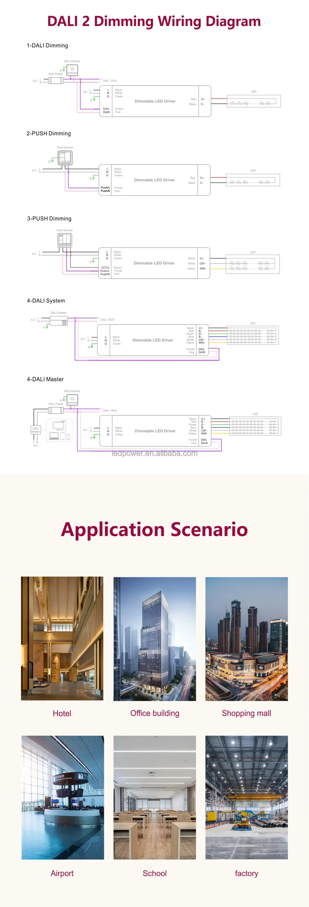 Независимо дали става дума за просто едноцветно затъмняване на температурата или сложно 5-канално Rgb Cct сценично програмиране, това захранване на драйвера може стабилно да отговаря на стандартните DALI инструкции. Това означава, че можете лесно да го интегрирате във всяка интелигентна осветителна система DALI, за да постигнете групов контрол, времево програмиране и свързване на сензори. Като надежден 12-24 V постоянно напрежение DALI димируем LED драйвер, неговата изключителна електрическа производителност гарантира, че LED светлинните ленти работят стабилно и ефективно за дълго време.