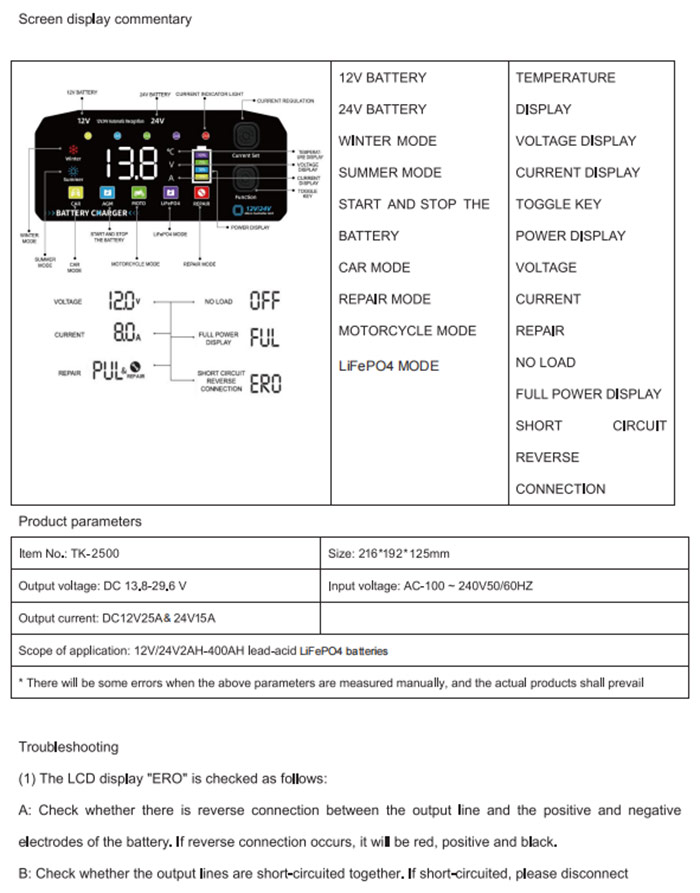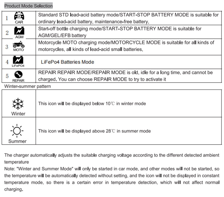 Широка поддръжка на типове батерии: Съвместим с различни химически батерии, включително стандартни наводнени (мокри), AGM (абсорбиращи стъклени батерии), гел и калциеви батерии, осигуряващи оптимално зареждане за всеки конкретен тип.