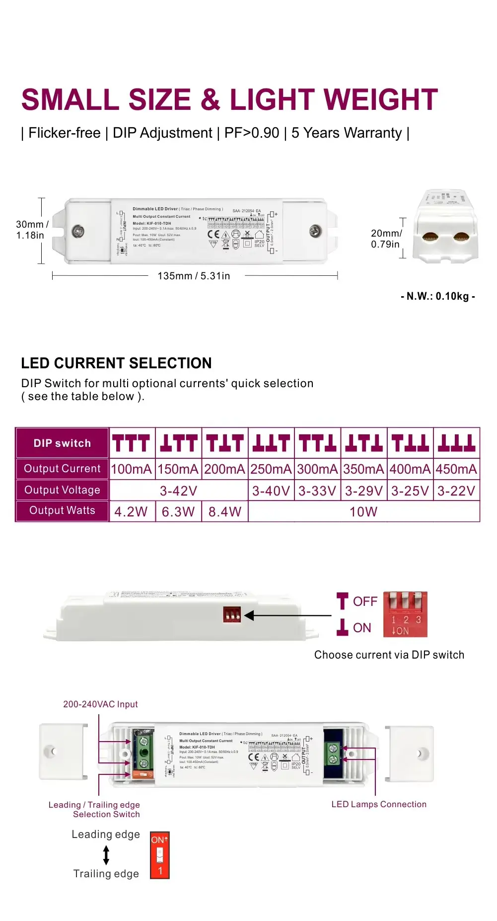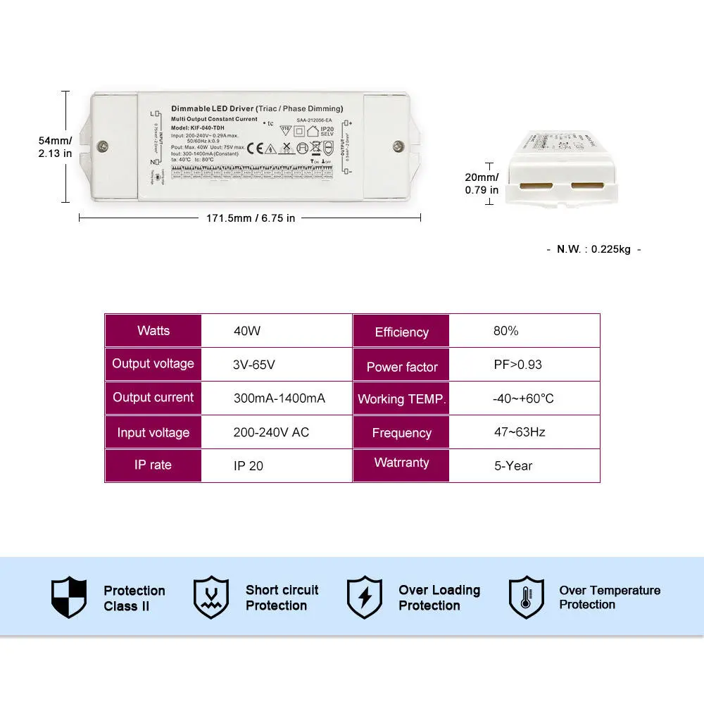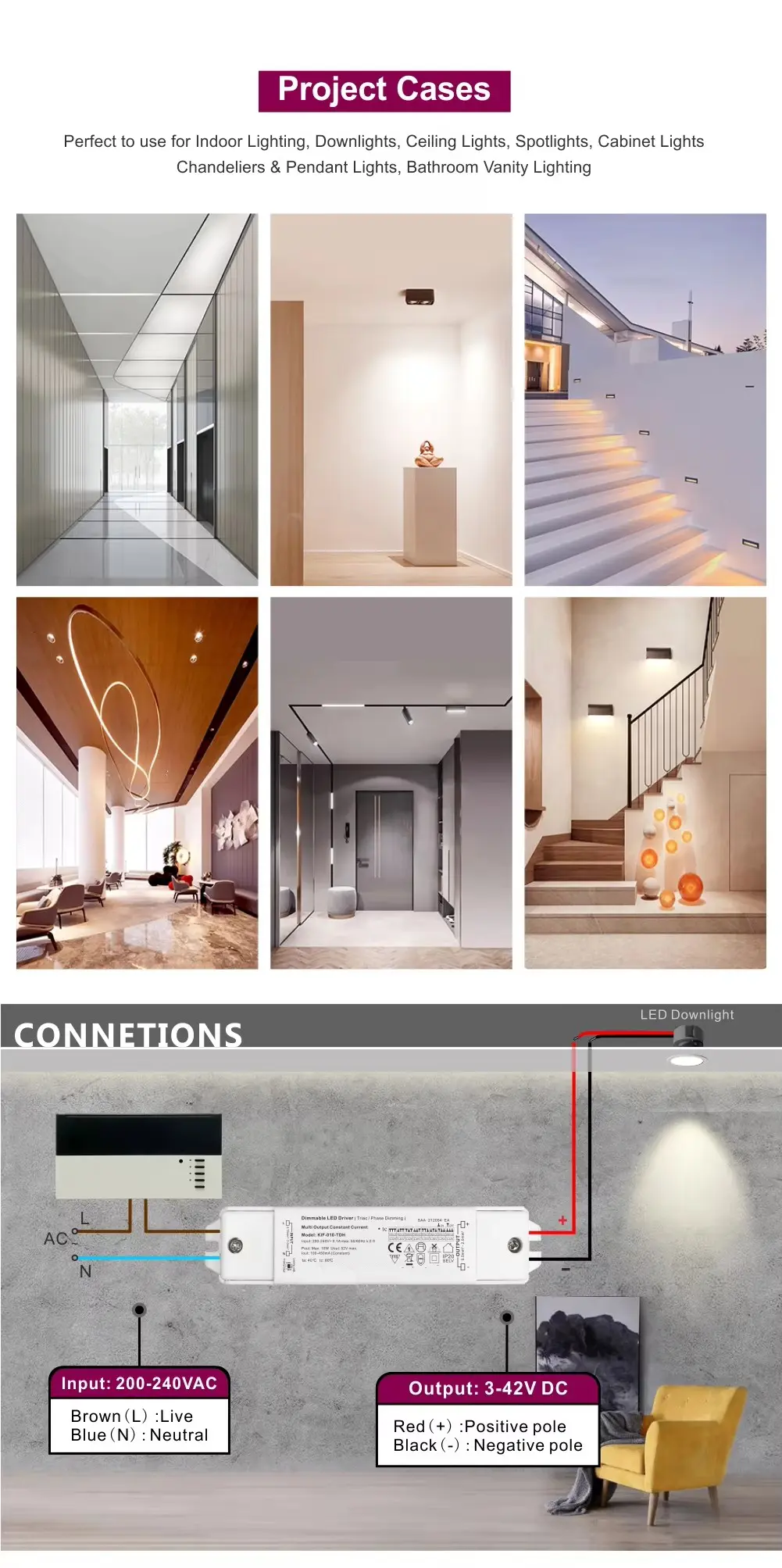 Стабилен и защитен постоянен ток: Поддържа прецизен, постоянен изходен ток към вашите LED модули, осигурявайки постоянна яркост, еднородност на цветовете и удължен живот на LED чрез защита срещу текущи флуктуации и пренапрежения.