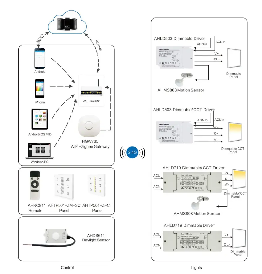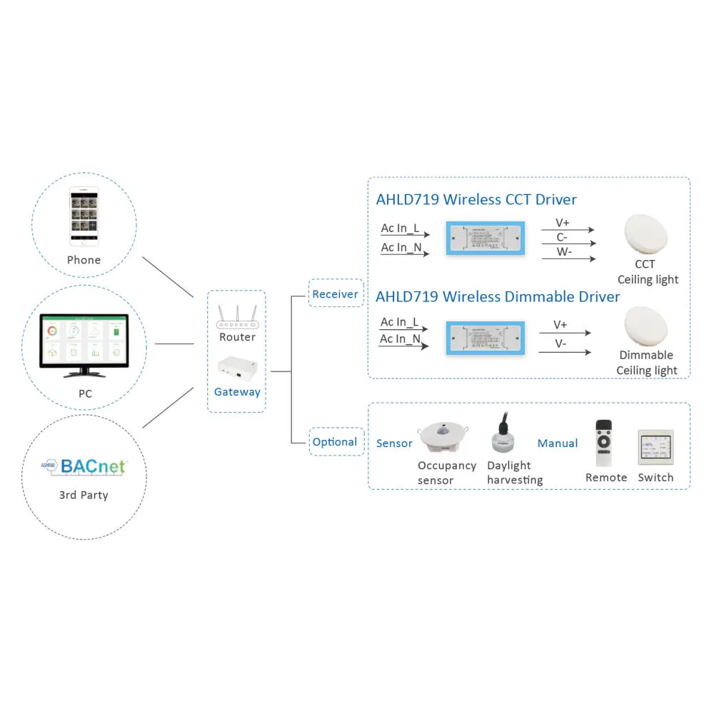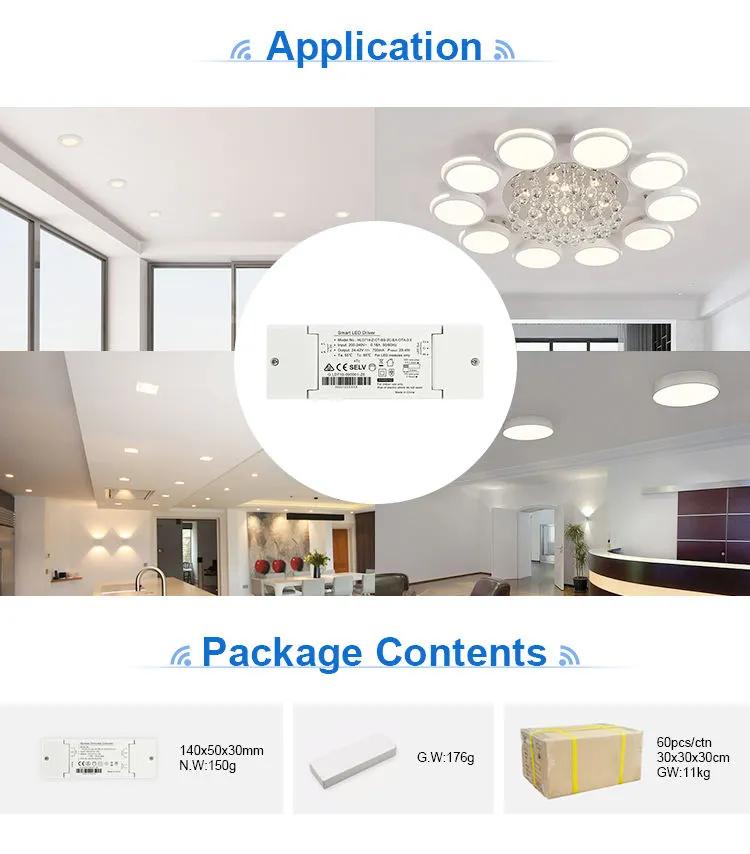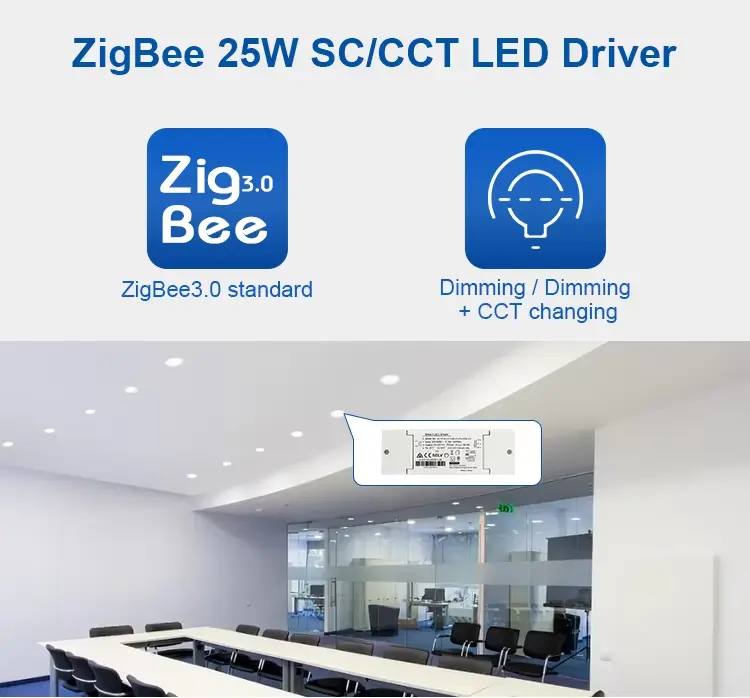 Драйверът работи в Zigbee мрежова мрежа и се свързва към Zigbee шлюз, за да активира интелигентни функции за осветление като планиране, контрол на сцени, групов контрол и автоматизация. Този тип LED драйвер обикновено се използва в системи за интелигентно домашно осветление, търговски осветителни инсталации и среди за интелигентно управление на сгради.